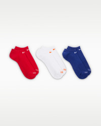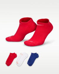 The Nike Everyday Plus Cushioned Socks bring comfort to your workout with extra cushioning under the heel and forefoot and a snug, supportive arch band. Sweat-wicking power and breathability up top help keep your feet dry and cool to help push you through that extra set. Benefits - Cushioning under the forefoot and heel helps soften the impact of your workout. - Dri-FIT technology helps your feet stay dry and comfortable. - Band around the arch feels snug and supportive. - Breathable knit pattern on top adds ventilation. - Reinforced heel and toe are made to last. Product Details - Fabric: 65-72% cotton/26-33% polyester/2% spandex - Machine wash - Imported - Note: Material percentages may vary depending on color. Check label for actual content. - Shown: Multi-Color - Style: SX6889-996