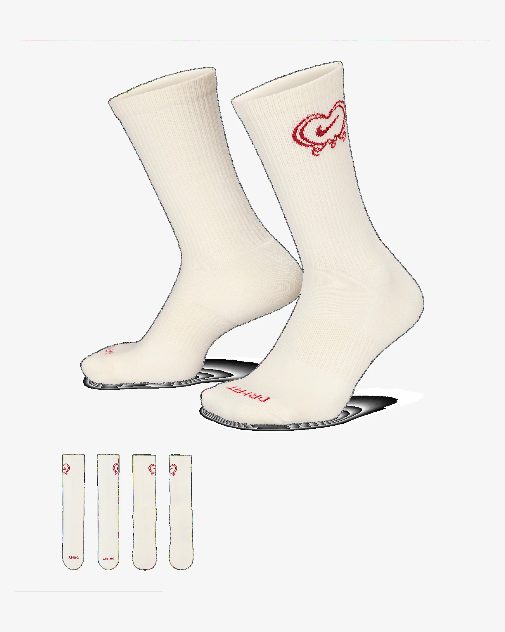 Show your feet some love with these socks. Like all Nike Everyday socks, they have sweat-wicking technology to help keep you dry and comfortable. Benefits - Nike Dri-FIT technology moves sweat away from your skin for quicker evaporation, helping you stay dry and comfortable. - Band around the arch feels snug and supportive. Product Details - 67% cotton/30% polyester/2% spandex/1% nylon. - Machine wash - Imported - Shown: Sail/Team Crimson - Style: IH8626-133