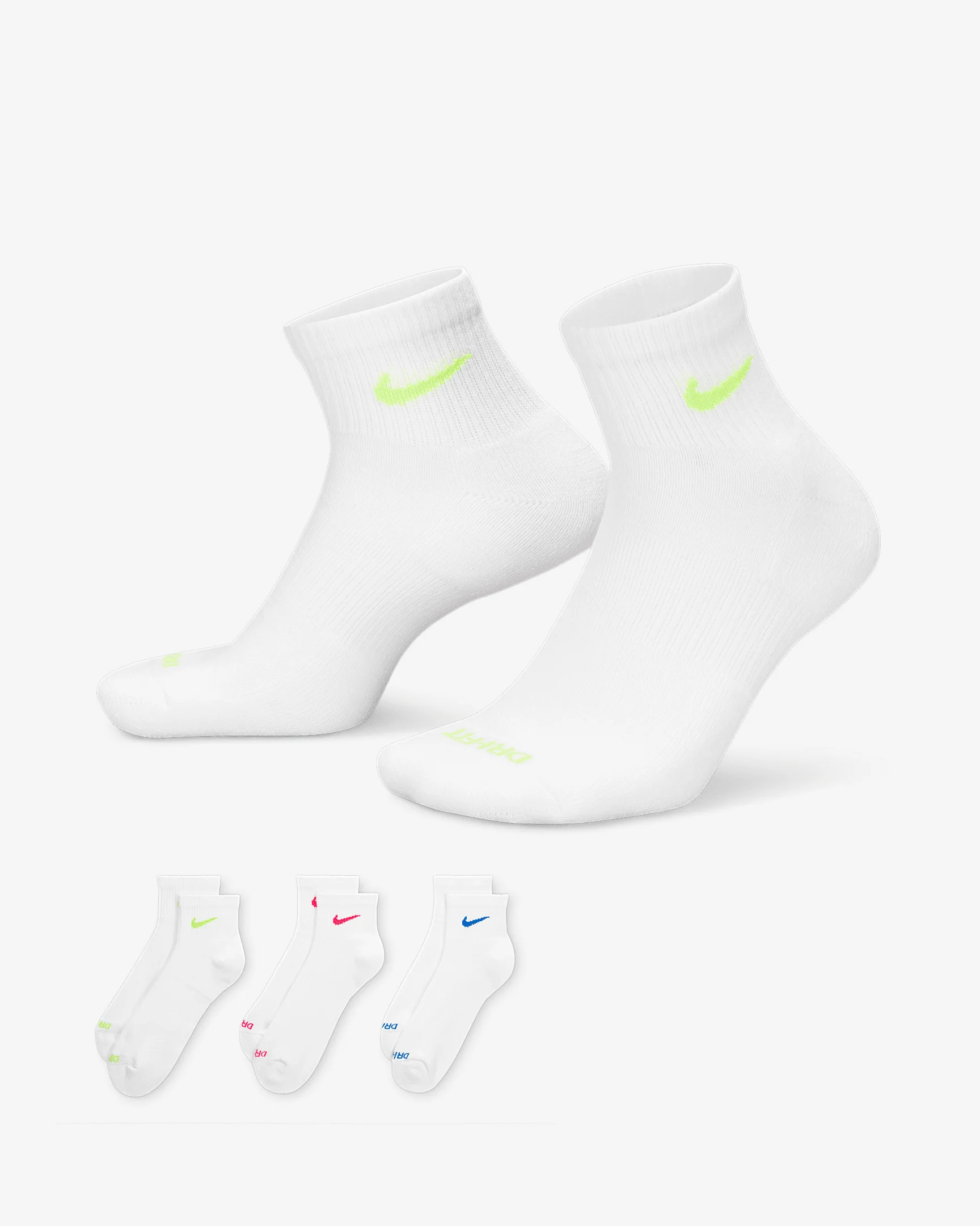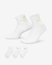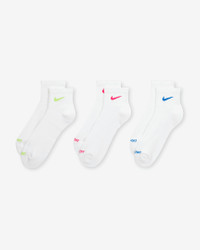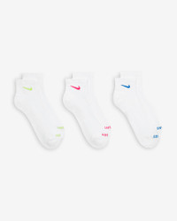 The Nike Everyday Plus Cushioned Socks bring comfort to your workout with extra cushioning under the heel and forefoot and a snug, supportive arch band. Sweat-wicking power and breathability up top help keep your feet dry and cool to help push you through that extra set. Benefits - Cushioning under the forefoot and heel helps soften the impact of your workout. - Dri-FIT technology helps your feet stay dry and comfortable. - Band around the arch feels snug and supportive. - Breathable knit pattern on top adds ventilation. - Reinforced heel and toe are made to last. Product Details - 63-70% cotton/28-35% polyester/2% polyurethane - Note: Material percentages may vary. Check label for actual content. - Machine wash - Imported - Shown: Multi-Color - Style: SX6890-938