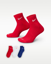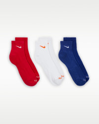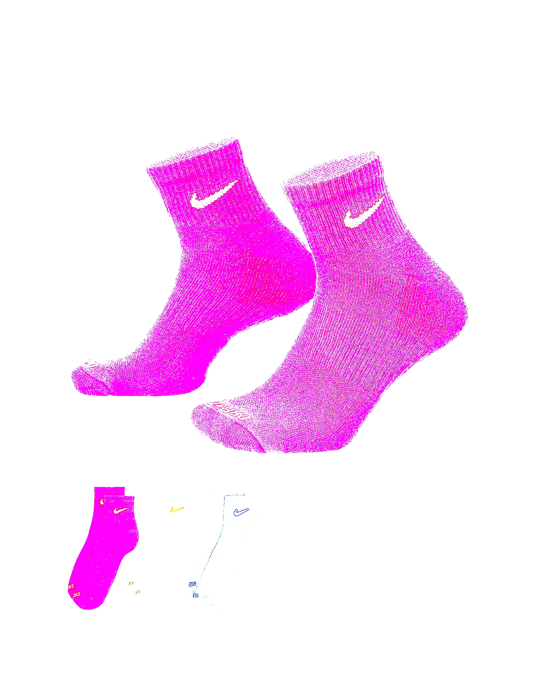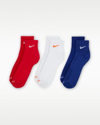 The Nike Everyday Plus Cushioned Socks bring comfort to your workout with extra cushioning under the heel and forefoot and a snug, supportive arch band. Sweat-wicking power and breathability up top help keep your feet dry and cool to help push you through that extra set. Benefits - Cushioning under the forefoot and heel helps soften the impact of your workout. - Dri-FIT technology helps your feet stay dry and comfortable. - Band around the arch feels snug and supportive. - Breathable knit pattern on top adds ventilation. - Reinforced heel and toe are made to last. Product Details - 63-70% cotton/28-35% polyester/2% polyurethane - Note: Material percentages may vary. Check label for actual content. - Machine wash - Imported - Shown: Multi-Color - Style: SX6890-996