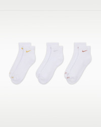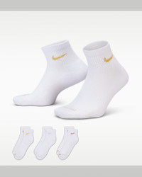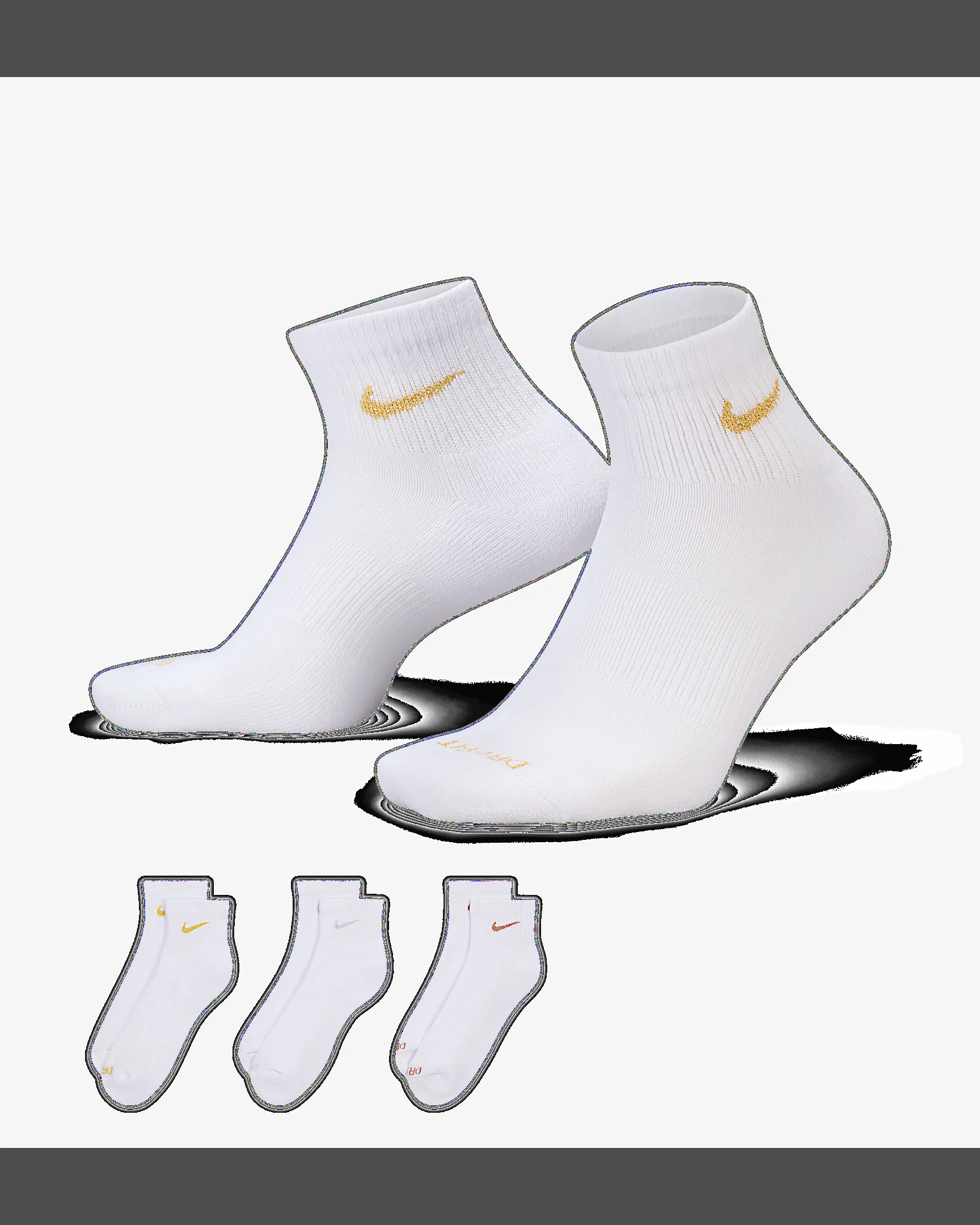 The Nike Everyday Plus Cushioned Socks bring comfort to your workout with extra cushioning under the heel and forefoot and a snug, supportive arch band. Sweat-wicking power and breathability up top help keep your feet dry and cool to help push you through that extra set. Benefits - Cushioning under the forefoot and heel helps soften the impact of your workout. - Dri-FIT technology helps your feet stay dry and comfortable. - Band around the arch feels snug and supportive. - Breathable knit pattern on top adds ventilation. - Reinforced heel and toe are made to last. Product Details - 63-70% cotton/28-35% polyester/2% polyurethane - Note: Material percentages may vary. Check label for actual content. - Machine wash - Imported - Shown: Multi-Color - Style: SX6890-941