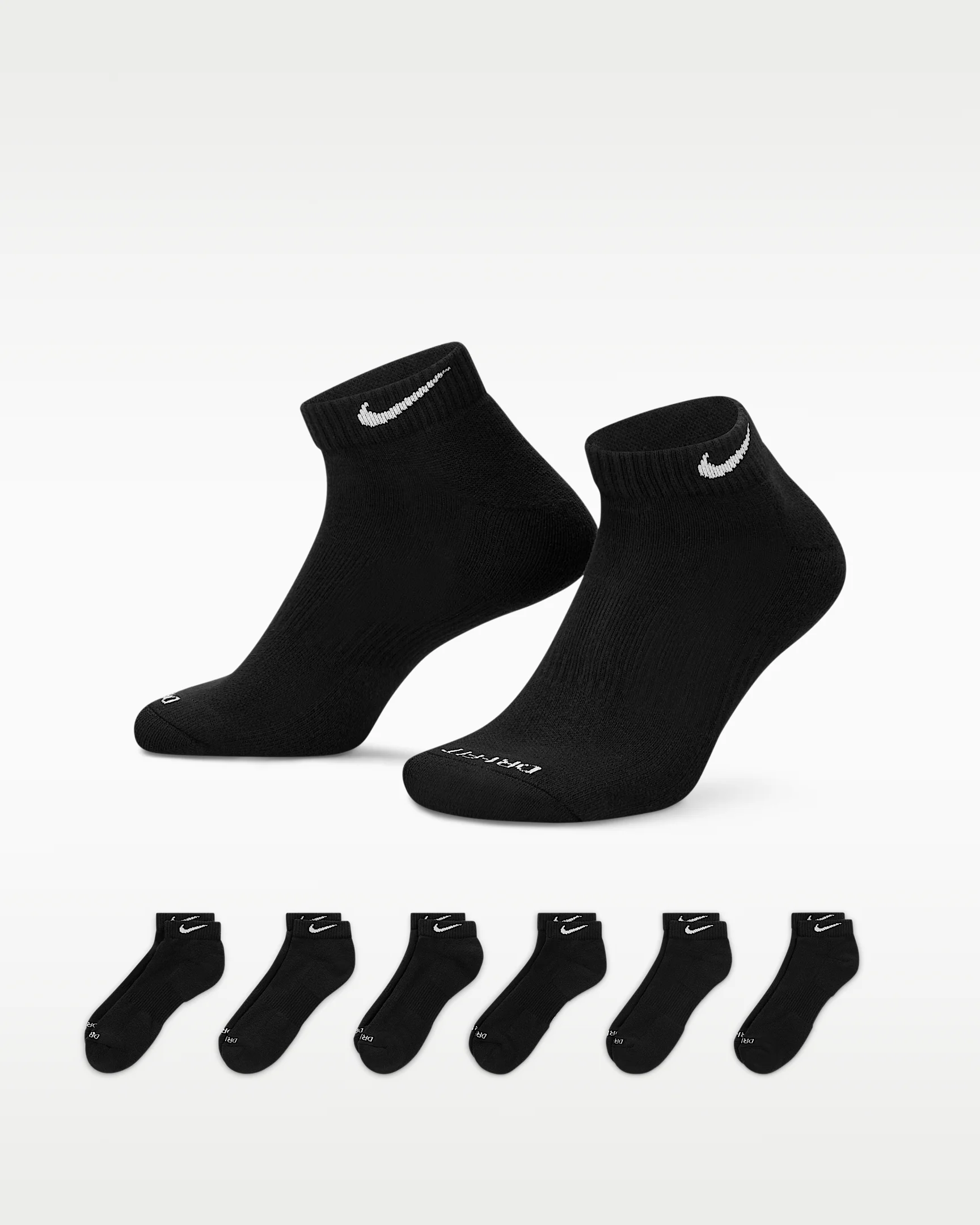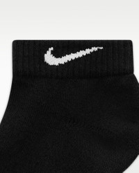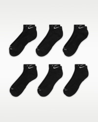 The Nike Everyday Plus Cushioned Socks bring comfort to your workout with extra cushioning under the heel and forefoot and a snug, supportive arch band. Sweat-wicking power and breathability up top help keep your feet dry and cool to help push you through that extra set. Benefits - Cushioning under the forefoot and heel helps soften the impact of your workout. - Dri-FIT technology helps your feet stay dry and comfortable. - Band around the arch feels snug and supportive. - Breathable knit pattern on top adds ventilation. - Reinforced heel and toe are made to last. Product Details - 61-68% cotton/29-36% polyester/2% spandex/1% nylon - Material percentages may vary. Check label for actual content. - Machine wash - Imported - Shown: Black/White - Style: SX7042-010