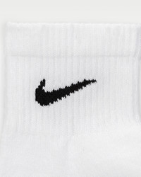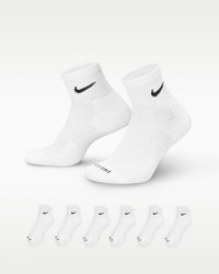 The Nike Everyday Plus Cushioned Socks bring comfort to your workout with extra cushioning under the heel and forefoot and a snug, supportive arch band. Sweat-wicking power and breathability up top help keep your feet dry and cool to help push you through that extra set. Benefits - Cushioning under the forefoot and heel helps soften the impact of your workout. - Dri-FIT technology helps your feet stay dry and comfortable. - Band around the arch feels snug and supportive. - Breathable knit pattern on top adds ventilation. - Reinforced heel and toe are made to last. Product Details - Fabric (heather): 62% cotton/35% polyester/2% spandex/1% nylon - Fabric (solid): 68% cotton/29% polyester/2% spandex/1% nylon - Machine wash - Imported - Shown: White/Black - Style: SX6899-100