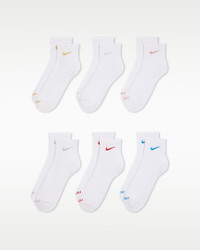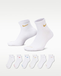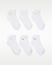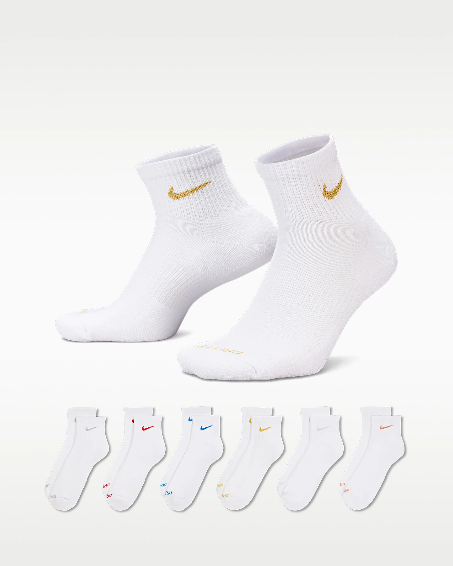 The Nike Everyday Plus Cushioned Socks bring comfort to your workout with extra cushioning under the heel and forefoot and a snug, supportive arch band. Sweat-wicking power and breathability up top help keep your feet dry and cool to help push you through that extra set. Benefits - Cushioning under the forefoot and heel helps soften the impact of your workout. - Dri-FIT technology helps your feet stay dry and comfortable. - Band around the arch feels snug and supportive. - Breathable knit pattern on top adds ventilation. - Reinforced heel and toe are made to last. Product Details - Fabric (heather): 62% cotton/35% polyester/2% spandex/1% nylon - Fabric (solid): 68% cotton/29% polyester/2% spandex/1% nylon - Machine wash - Imported - Shown: Multi-Color - Style: SX6899-941