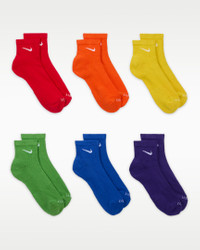 The Nike Everyday Plus Cushioned Socks bring comfort to your workout with extra cushioning under the heel and forefoot and a snug, supportive arch band. Sweat-wicking power and breathability up top help keep your feet dry and cool to help push you through that extra set. Benefits - Cushioning under the forefoot and heel helps soften the impact of your workout. - Dri-FIT technology helps your feet stay dry and comfortable. - Band around the arch feels snug and supportive. - Breathable knit pattern on top adds ventilation. - Reinforced heel and toe are made to last. Product Details - Fabric (heather): 62% cotton/35% polyester/2% spandex/1% nylon - Fabric (solid): 68% cotton/29% polyester/2% spandex/1% nylon - Machine wash - Imported - Shown: Multi-Color - Style: SX6899-903