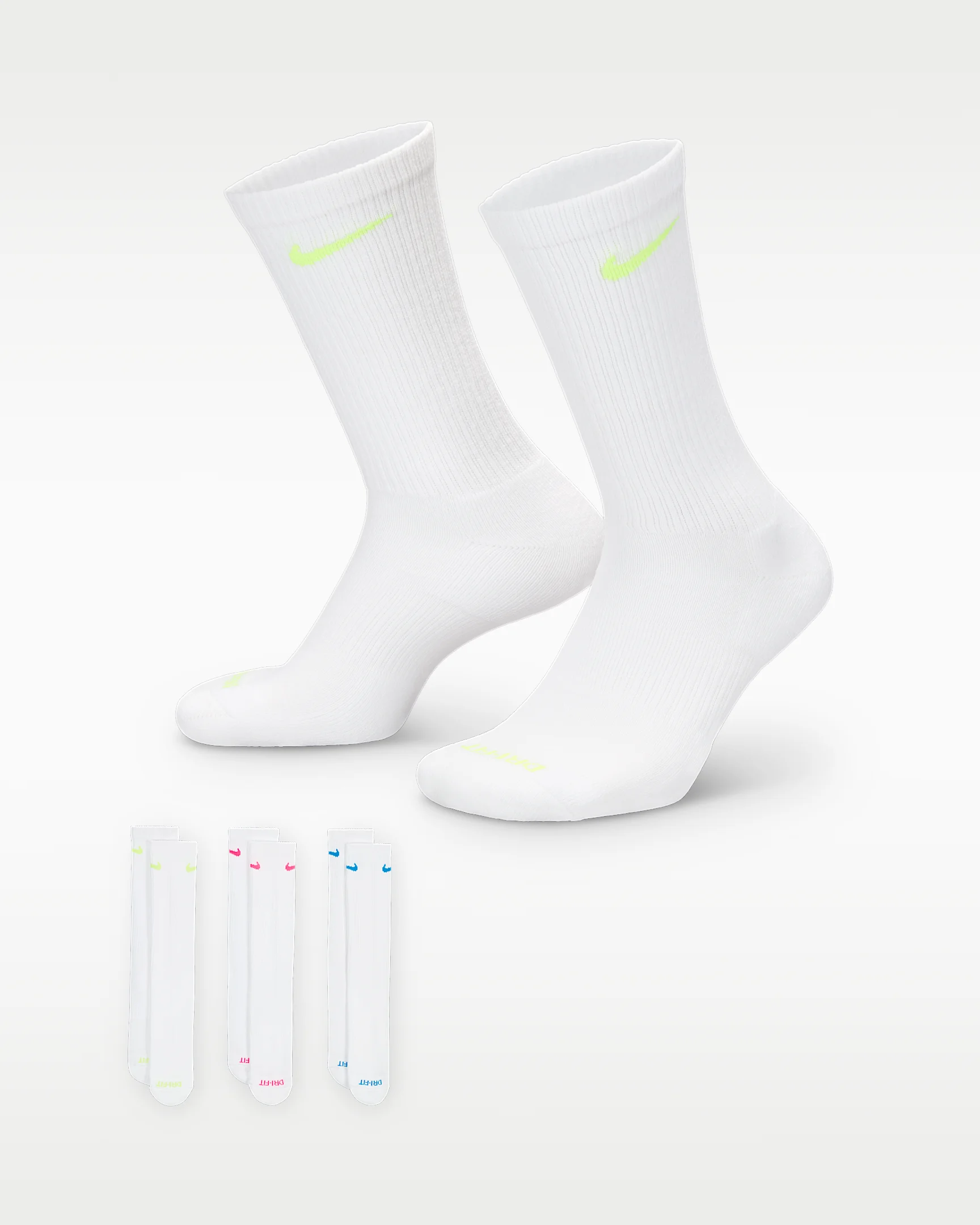 The Nike Everyday Plus Cushioned Socks bring comfort to your workout with extra cushioning under the heel and forefoot and a snug, supportive arch band. Sweat-wicking power and breathability up top help keep your feet dry and cool to help push you through that extra set. Benefits - Cushioning under the forefoot and heel helps soften the impact of your workout. - Dri-FIT technology helps your feet stay dry and comfortable. - Band around the arch feels snug and supportive. - Breathable knit pattern on top adds ventilation. - Reinforced heel and toe are made to last. Product Details - Fabric: 62-69% cotton/29-36% polyester/2% polyurethane - Note: Material percentages may vary depending on color. Check label for actual content. - Machine wash - Imported - Shown: Multi-Color - Style: SX6888-938