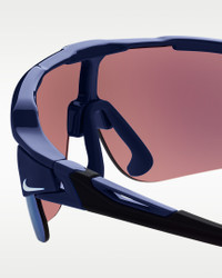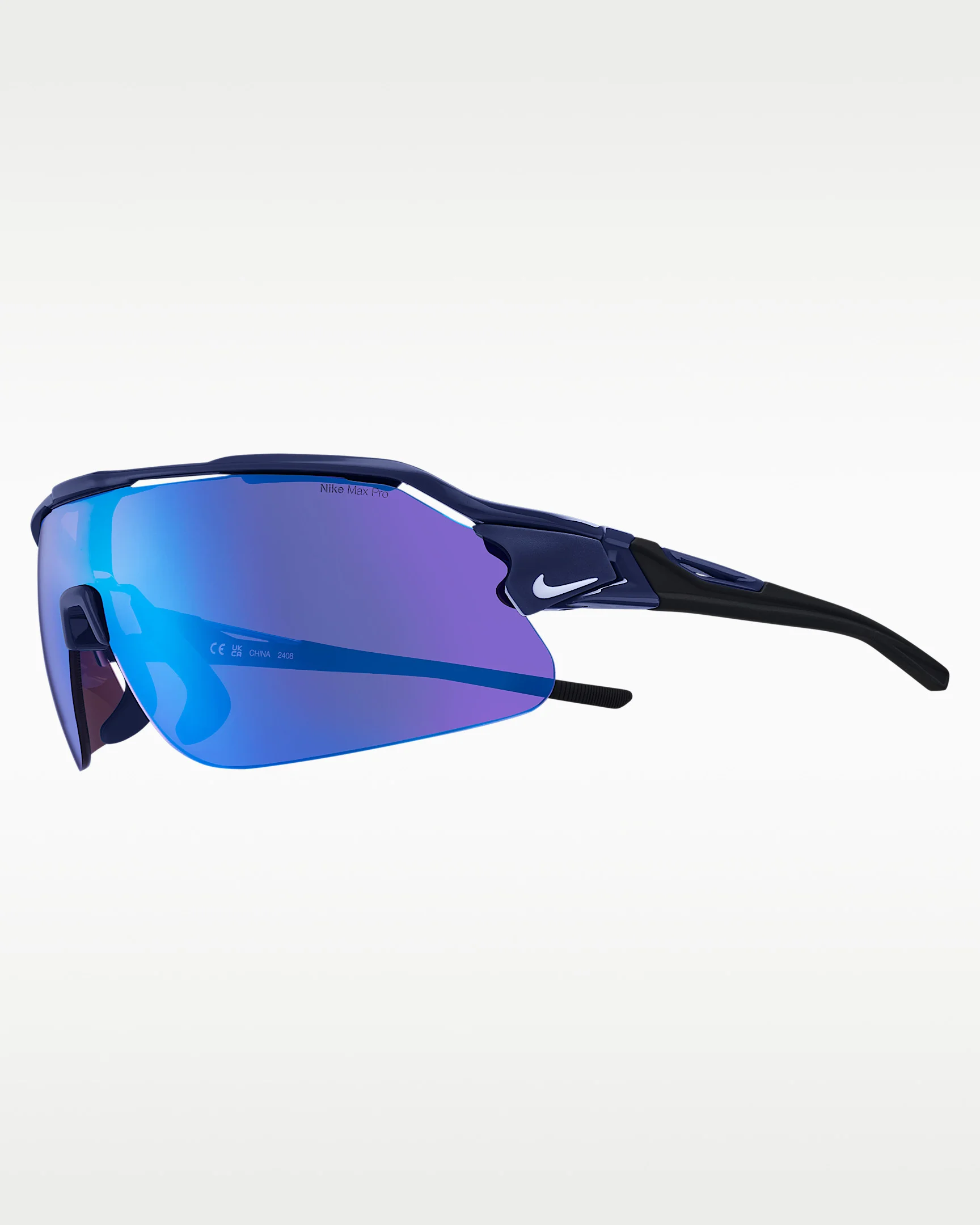 Never let a new environment change how you choose to sport. Introducing the latest edition of the Nike Flyfree stripped down for pure performance. The Nike Flyfree Shield offers a panoramic, single-lens design with the same interchangeable lens options to enhance performance in any environment. The adjustable nose pads and temples are made to provide constant comfort and support. Benefits - Frame size: 72mm lens width; 5mm bridge width; 130mm temple length - Nike Road Tint blocks harsh light on the track and road - Nike Max Pro helps reduce light reflection while repelling water and oil for a clearer view of what's ahead. - 6-base curved lens offers medium coverage with moderate peripheral light blockage - Adjustable nose pads and temples with silicone sleeves provide enhanced grip and optimal fit. Product Details - Shown: Midnight Navy - Style: NKIF1107-410