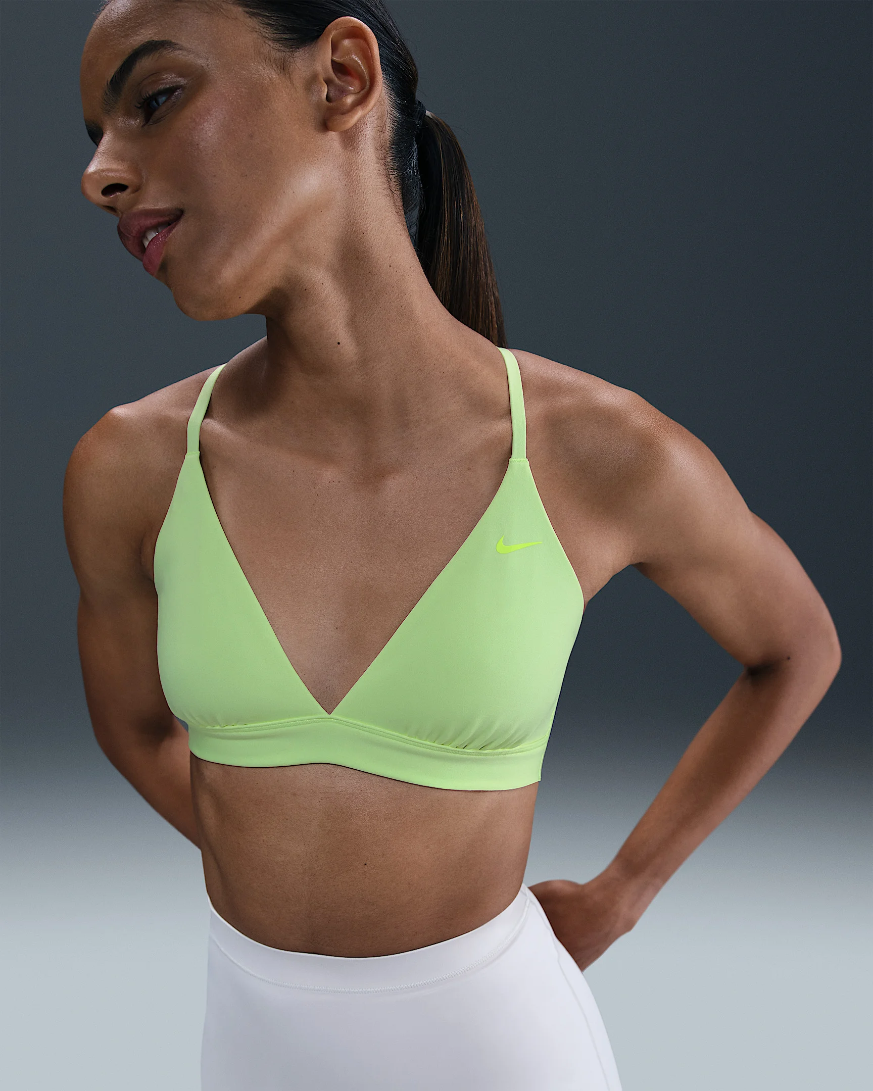 Show off your form—not your sweat. Designed with Stealth Evaporation technology, this triangle bra conceals moisture to help you stay looking fresh. Midweight, ultrasoft fabric offers smooth coverage, while light support gives you a gentle hold with plenty of freedom. Product Details - Silicone Swoosh logo on left chest - Body/Lining: 76% polyester/24% spandex - Machine wash - Imported - Shown: Barely Volt/Barely Volt/Volt Ice - Style: HQ7003-701 SIZE & FIT Model is wearing size S Model height: 5′10″178cm Model bust: 31″79cm Tight fit: snug and form-fitting Light support: feels ke a soft hug with plenty of freedom