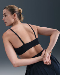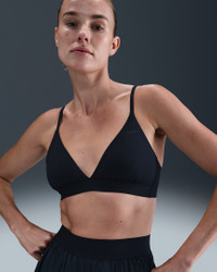 Show off your form—not your sweat. Designed with Stealth Evaporation technology, this triangle bra conceals moisture to help you stay looking fresh. Midweight, ultrasoft fabric offers smooth coverage, while light support gives you a gentle hold with plenty of freedom. Product Details - Silicone Swoosh logo on left chest - Body/Lining: 76% polyester/24% spandex - Machine wash - Imported - Shown: Black/Smoke Grey/Dark Smoke Grey - Style: HQ7003-011 SIZE & FIT Model is wearing size S Model height: 5′7″170cm Model bust: 32″81cm Tight fit: snug and form-fitting Light support: feels ke a soft hug with plenty of freedom