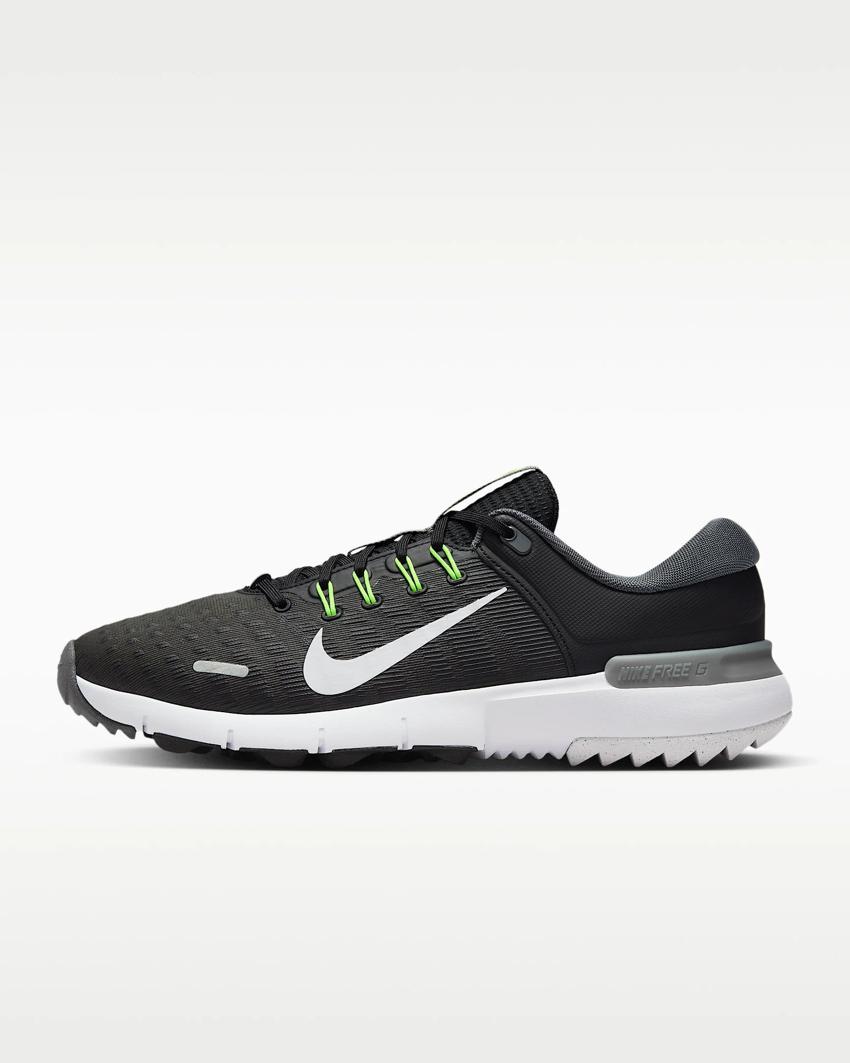 A blast from the past, the Nike Free Golf uses some of our favorite running footwear technology to make it even more functional than before. It's our lowest-to-the-ground golf shoe, offering freedom when you’re on the hoof or housing an approach shot from deep. More Benefits - Wet traction rubber pattern helps keep you upright when in wet conditions. - Tough plastic clip around the heel helps give you stability. Product Details - 1-year waterproof warranty - Cushioned insole - Reflective details - Not intended for use as Personal Protective Equipment (PPE) - Shown: Black/Iron Grey/Volt/White - Style: FQ7875-001