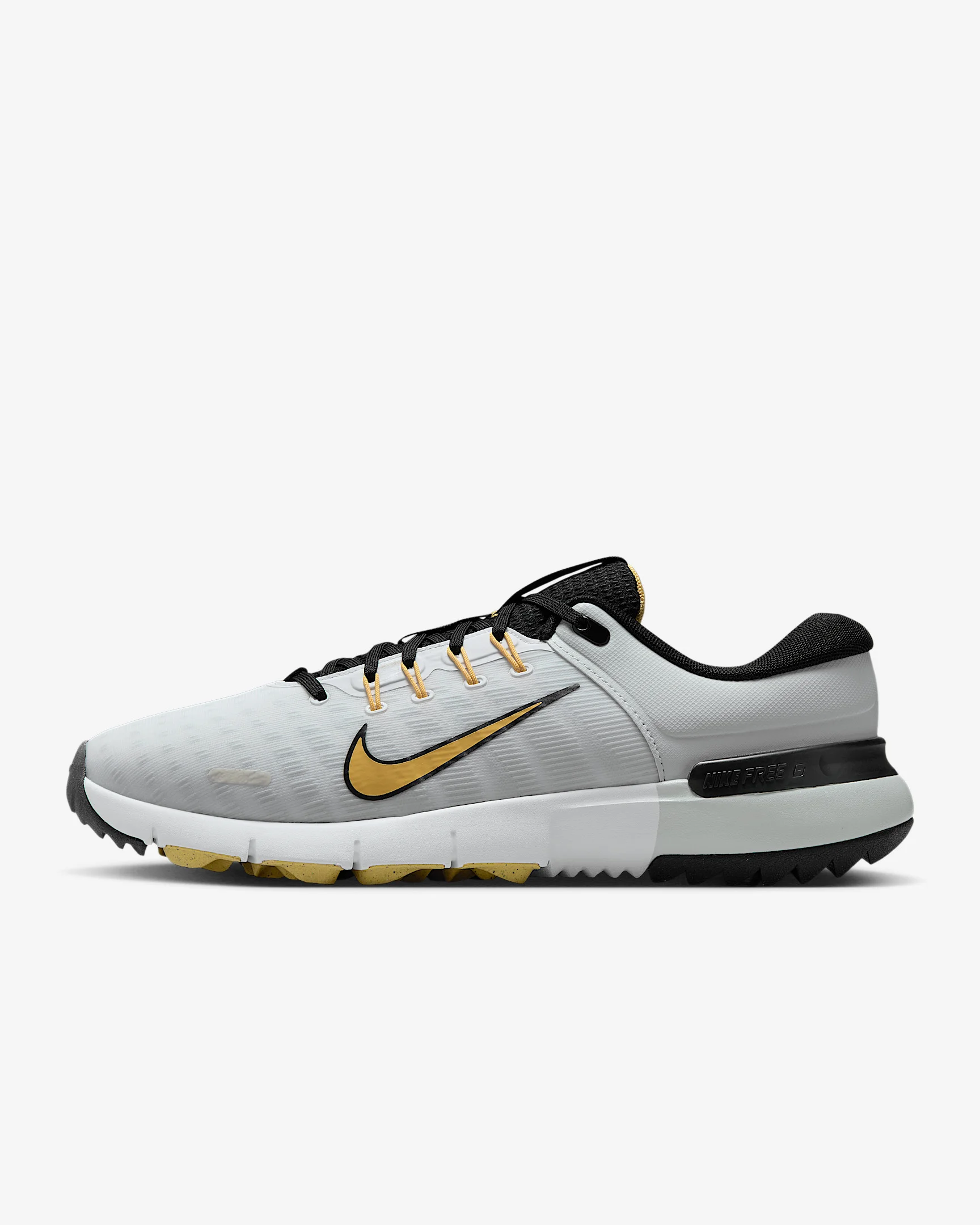 A blast from the past, the Nike Free Golf uses some of our favorite running footwear technology to make it even more functional than before. It's our lowest-to-the-ground golf shoe, offering freedom when you’re on the hoof or housing an approach shot from deep. More Benefits - Wet traction rubber pattern helps keep you upright when in wet conditions. - Tough plastic clip around the heel helps give you stability. Product Details - 1-year waterproof warranty - Cushioned insole - Reflective details - Not intended for use as Personal Protective Equipment (PPE) - Shown: White/Black/Pure Platinum/Topaz Gold - Style: FN0332-105