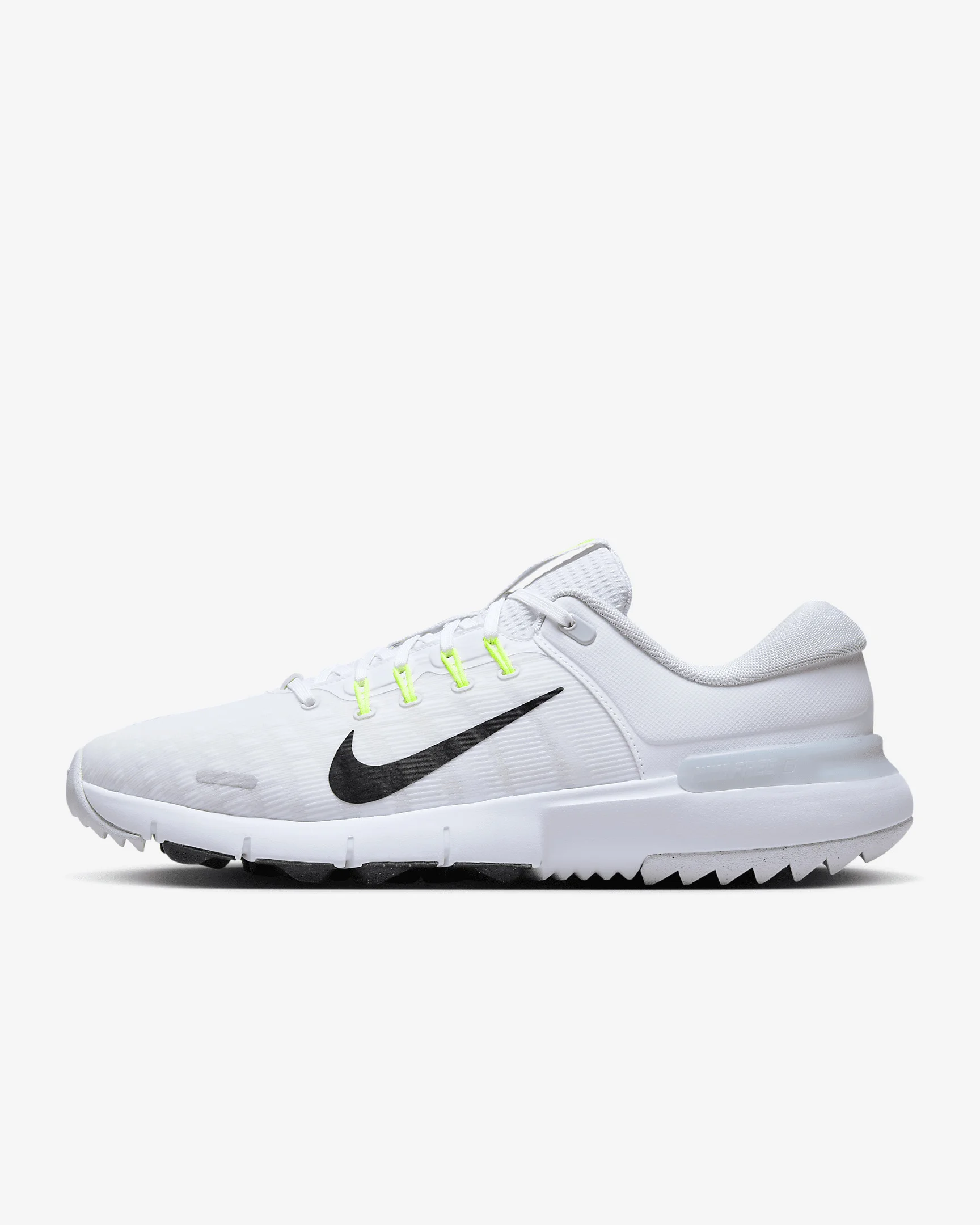 A blast from the past, the Nike Free Golf uses some of our favorite running footwear technology to make it even more functional than before. It's our lowest-to-the-ground golf shoe, offering freedom when you’re on the hoof or housing an approach shot from deep. More Benefits - Wet traction rubber pattern helps keep you upright when in wet conditions. - Tough plastic clip around the heel helps give you stability. Product Details - 1-year waterproof warranty - Cushioned insole - Reflective details - Not intended for use as Personal Protective Equipment (PPE) - Shown: White/Pure Platinum/Wolf Grey/Black - Style: FN0332-101