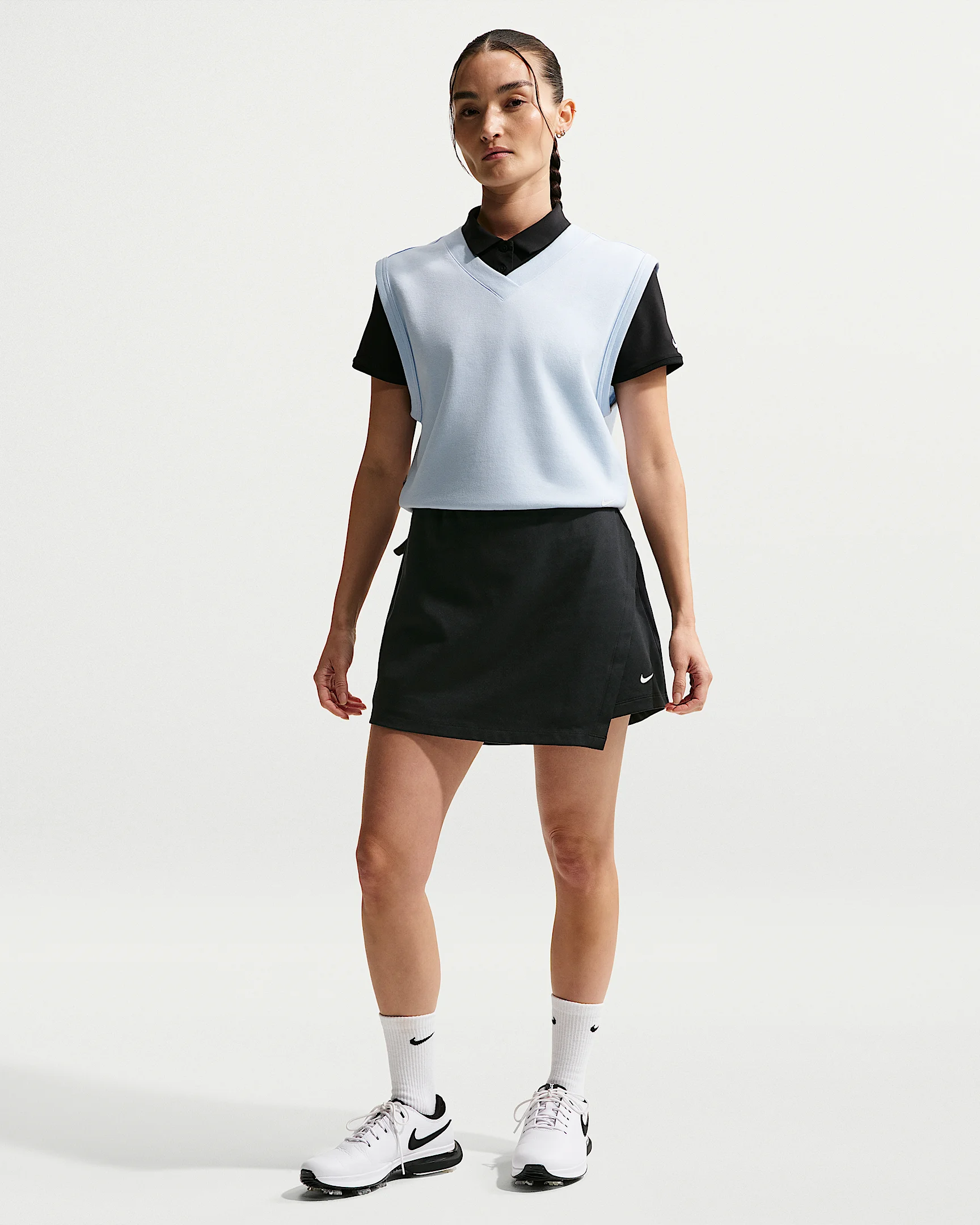 Built-in shorts give this skirt an athletic feel ready for your biggest rounds of the year. The overlap construction uses a sweat-wicking, midweight woven fabric to help keep you cool and dry in higher temps. Back pockets provide quick storage for golf essentials. Benefits - Nike Dri-FIT technology moves sweat away from your skin for quicker evaporation, helping you stay dry and comfortable. - Midweight, peachy-soft fabric stretches with your every move and dries quickly. - Stretchy built-in shorts help keep you covered. Product Details - Swoosh logo - 15" skirt length - 80% polyester/20% spandex - Machine wash - Imported - Shown: Black/Sail - Style: IF5989-010 SIZE & FIT Model is wearing size S and is 5'7"170cm Standard fit: easy and traditional