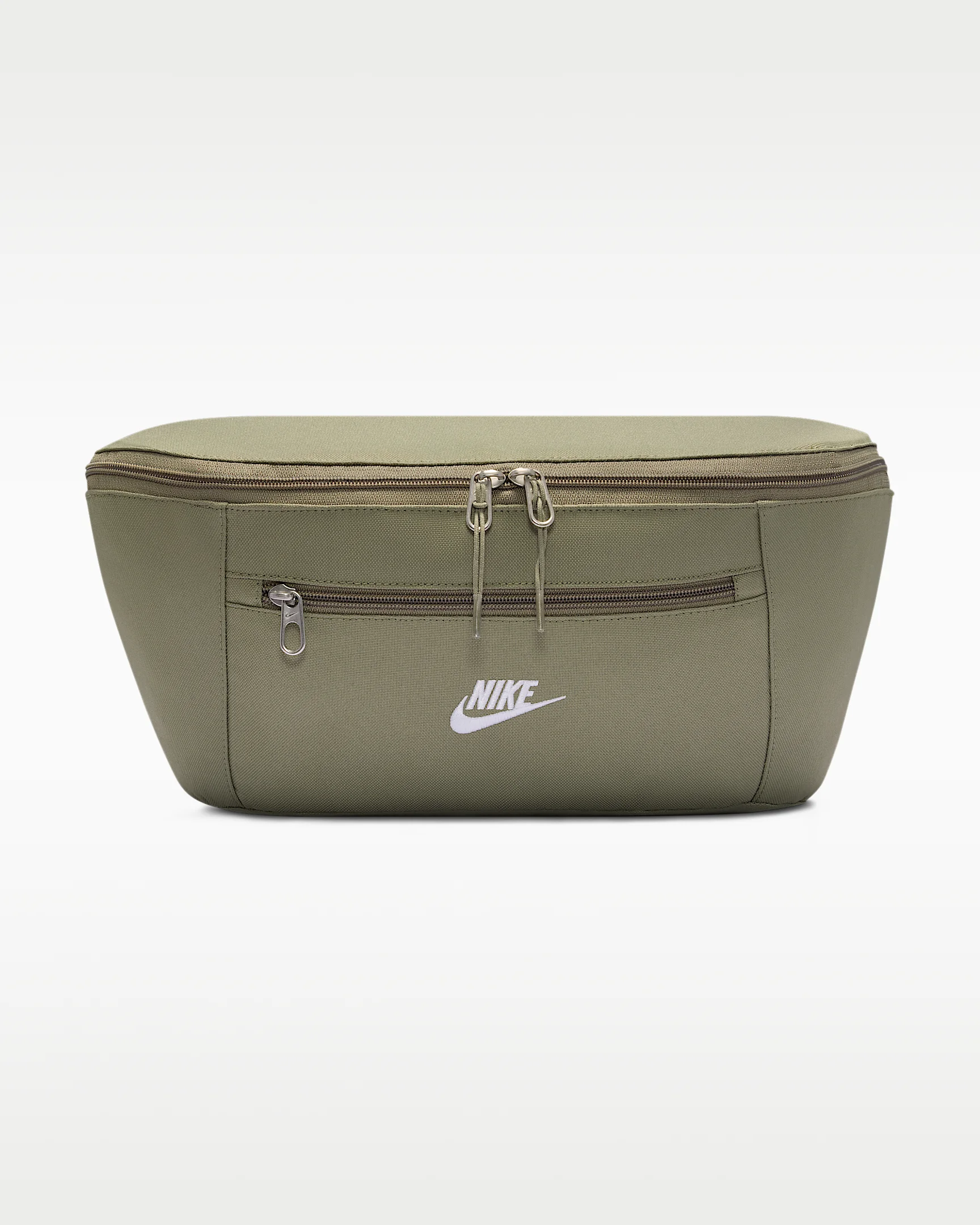 This extra large Nike Heritage waistpack has a main storage compartment, front and back zippered accessories pockets and two internal zippered slit pockets for lots of secure organization options. Product Details - 15" L x 6" W x 7" H - Embroidered logo - Adjustable strap - Body: 100% polyester. Lining: 100% polyester. - Spot clean - Imported - Shown: Light Army/Light Army/White - Style: IB4369-320