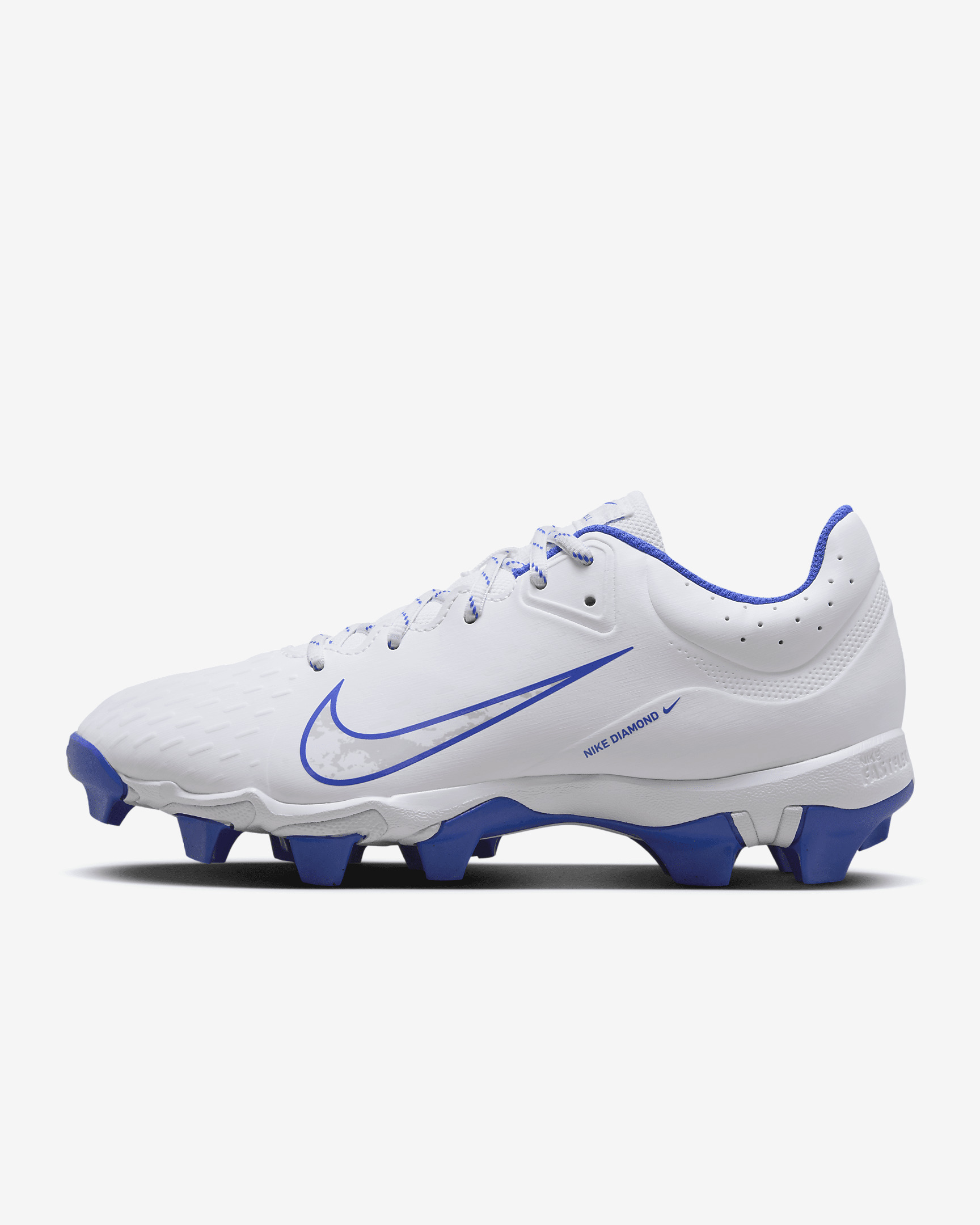 The Nike Hyperdiamond 4 Keystone is all about lightweight comfort on the diamond. Molded details on the upper add durability, while a flexible rubber sole with studs helps give you traction throughout the game or practice. Benefits - Synthetic on the upper with molded details provides durable comfort. - Nike Fastflex technology lets the rubber outsole bend with your foot so you can move freely. Product Details - Foam midsole - 12-cleat configuration for traction - Shown: White/Pure Platinum/Hyper Royal - Style: FZ0920-101