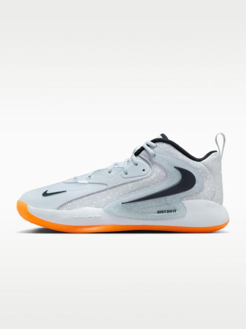 When the action heats up, stay in the middle of the fray with the Hyperset 2. A forefoot Air Zoom unit offers a unique pop when sprinting into position. You can attack at hyper speed without sacrificing comfort thanks to a foam midsole and lacing that helps keep you secure. This version is painted in a special pastel pop, with an iridescent Swoosh logo, multicolor-speckled midsole and spring-colored laces in the box, just in time for club season. Benefits - Snappy and responsive, Air Zoom cushioning helps provide a quick-off-the-ground sensation. - Flywire technology integrates with the laces to help secure your midfoot. - Mesh and synthetic leather with durable overlays offer breathable support. - Multidirectional traction gives you grip for netball, volleyball, badminton and other sports played on indoor courts. Product Details - Pull loops at heel and tongue - Rubber sole - Shown: White/Arctic Pink/Hyper Pink/White - Style: HF3241-100