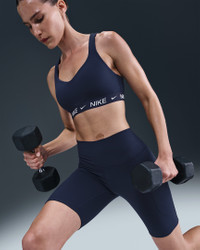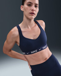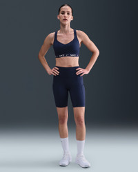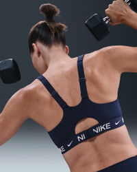In this sleek, stay-put sports bra, you're in control of your workout and your day. High support gives you a locked-in feeling and helps keep motion to a minimum, making it ideal for runs and high-impact sports. Smooth, quick-drying fabric gives the bra a clean finish so you can wear it your way. More Benefits - Nike Dri-FIT technology moves sweat away from your skin for quicker evaporation, helping you stay dry and comfortable. - Soft jacquard chest band sits snugly against your skin without pinching or binding. Product Details - Body: 78-79% polyester/21-22% spandex. Back lining: 84% polyester/16% spandex. Mesh: 82% polyester/18% spandex. Pad top fabric/Pad back fabric: 100% polyester. Pad: 100% polyurethane. - Machine wash - Imported - Shown: Midnight Navy - Style: FD1068-410 SIZE & FIT Model is wearing size S Model height: 5′10″178cm Model bust: 34″86cm Tight fit: snug and form-fitting High support: feels ke locked in support that keeps motion to a minimum