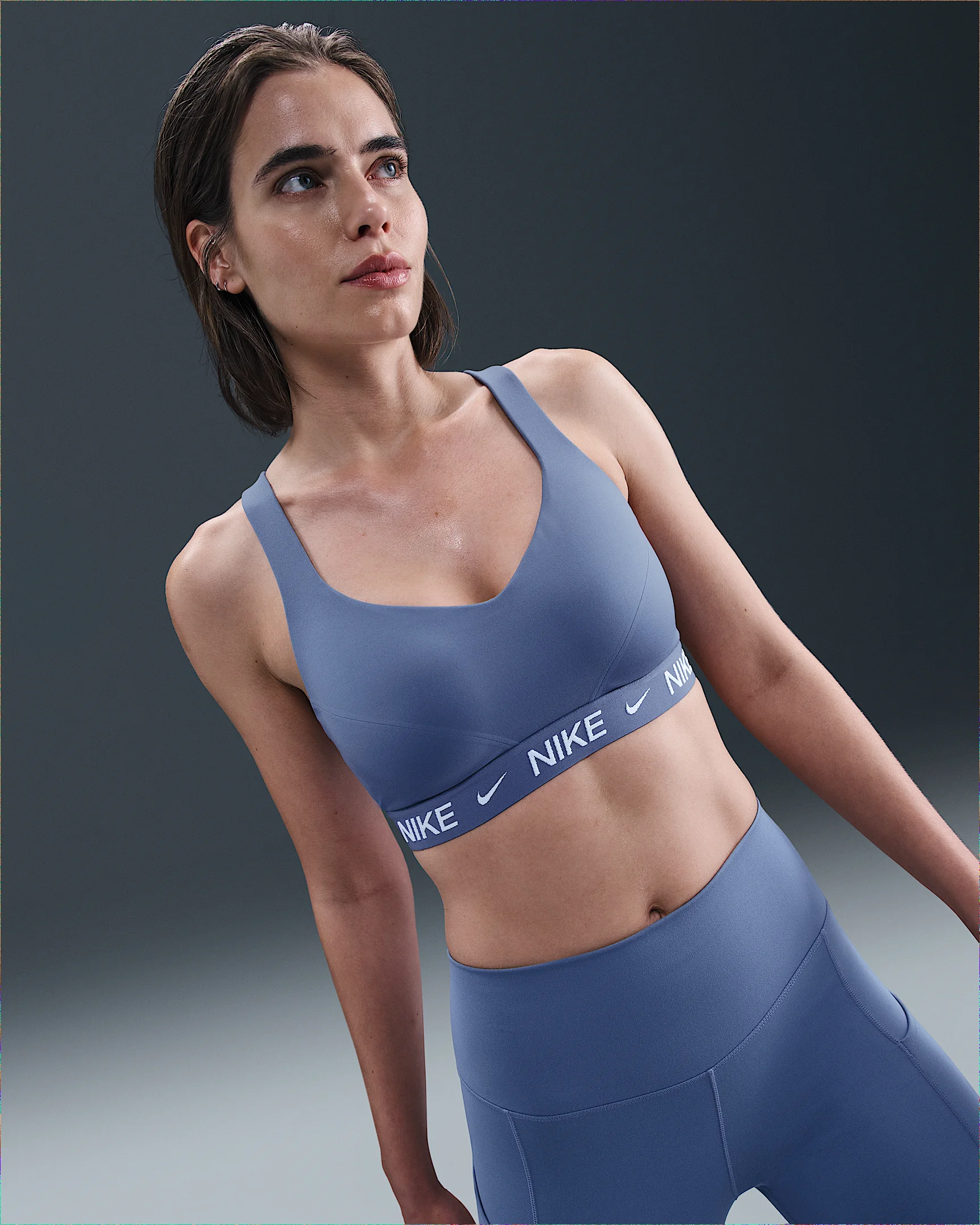 In this sleek, stay-put sports bra, you're in control of your workout and your day. High support gives you a locked-in feeling and helps keep motion to a minimum, making it ideal for runs and high-impact sports. Smooth, quick-drying fabric gives the bra a clean finish so you can wear it your way. More Benefits - Nike Dri-FIT technology moves sweat away from your skin for quicker evaporation, helping you stay dry and comfortable. - Soft jacquard chest band sits snugly against your skin without pinching or binding. Product Details - Body: 78-79% polyester/21-22% spandex. Back lining: 84% polyester/16% spandex. Mesh: 82% polyester/18% spandex. Pad top fabric/Pad back fabric: 100% polyester. Pad: 100% polyurethane. - Machine wash - Imported - Shown: World Indigo - Style: FD1068-499 SIZE & FIT Model is wearing size S Model height: 5′9″175cm Model bust: 32″81cm Tight fit: snug and form-fitting High support: feels ke locked in support that keeps motion to a minimum