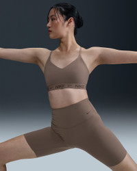 Don't let anything get in the way of expressing yourself in this sleek, low-profile sports bra. Its light support gives you a gentle hold with plenty of freedom that's great for low-impact workouts or all-day comfort. Smooth, quick-drying fabric gives the bra a clean finish so you can wear it your way. More Benefits - Nike Dri-FIT technology moves sweat away from your skin for quicker evaporation, helping you stay dry and comfortable. - Soft jacquard chest band sits snugly against your skin without pinching or binding. Product Details - Body: 78-79% polyester/21-22% spandex. Bottom hem: 53% polyester/28% nylon/19% spandex. Straps: 52% polyester/32% spandex/16% nylon. Lining: 84% polyester/16% spandex. Interlining: 80% polyester/20% spandex. Pad top fabric/Pad back fabric: 100% polyester. Pad: 100% polyurethane. - Machine wash - Imported - Shown: Mink Brown/Ironstone - Style: FD1062-233 SIZE & FIT Model is wearing size S Model height: 5′9″175cm Model bust: 32″81cm Tight fit: snug and form-fitting Light support: feels ke a soft hug with plenty of freedom