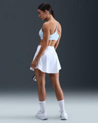 Don't let anything get in the way of expressing yourself in this sleek, low-profile sports bra. Its light support gives you a gentle hold with plenty of freedom that's great for low-impact workouts or all-day comfort. Smooth, quick-drying fabric gives the bra a clean finish so you can wear it your way. More Benefits - Nike Dri-FIT technology moves sweat away from your skin for quicker evaporation, helping you stay dry and comfortable. - Soft jacquard chest band sits snugly against your skin without pinching or binding. Product Details - Body: 78-79% polyester/21-22% spandex. Bottom hem: 53% polyester/28% nylon/19% spandex. Straps: 52% polyester/32% spandex/16% nylon. Lining: 84% polyester/16% spandex. Interlining: 80% polyester/20% spandex. Pad top fabric/Pad back fabric: 100% polyester. Pad: 100% polyurethane. - Machine wash - Imported - Shown: Celestine Blue - Style: FD1062-442 SIZE & FIT Tight fit: snug and form-fitting Light support: feels ke a soft hug with plenty of freedom