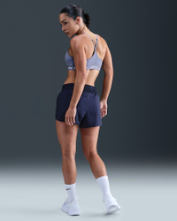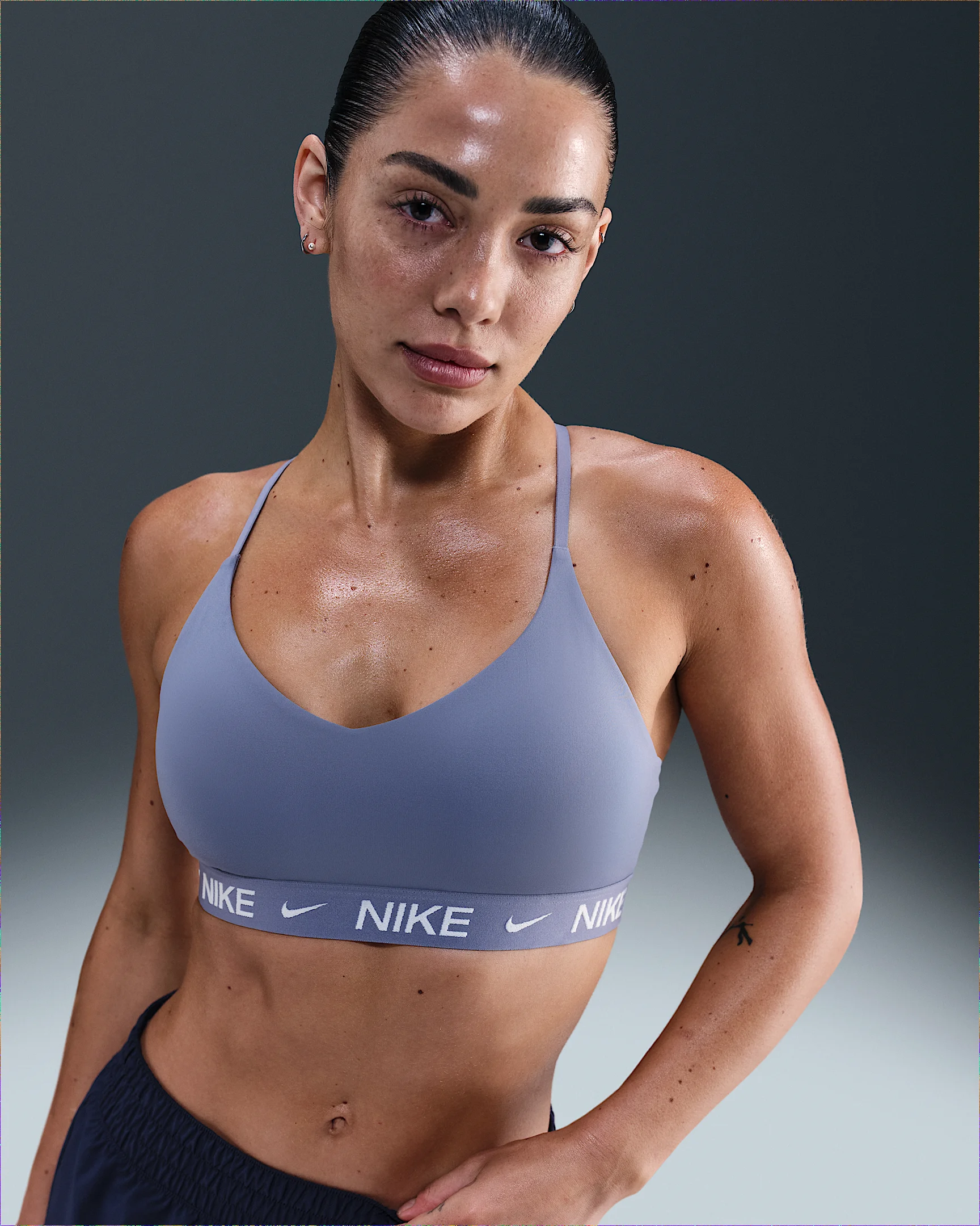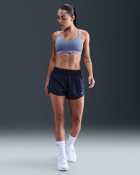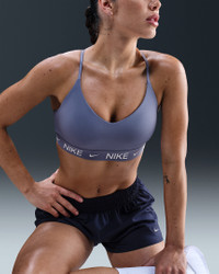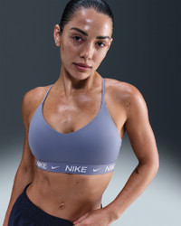 Don't let anything get in the way of expressing yourself in this sleek, low-profile sports bra. Its light support gives you a gentle hold with plenty of freedom that's great for low-impact workouts or all-day comfort. Smooth, quick-drying fabric gives the bra a clean finish so you can wear it your way. More Benefits - Nike Dri-FIT technology moves sweat away from your skin for quicker evaporation, helping you stay dry and comfortable. - Soft jacquard chest band sits snugly against your skin without pinching or binding. Product Details - Body: 78-79% polyester/21-22% spandex. Bottom hem: 53% polyester/28% nylon/19% spandex. Straps: 52% polyester/32% spandex/16% nylon. Lining: 84% polyester/16% spandex. Interlining: 80% polyester/20% spandex. Pad top fabric/Pad back fabric: 100% polyester. Pad: 100% polyurethane. - Machine wash - Imported - Shown: World Indigo - Style: FD1062-499 SIZE & FIT Model is wearing size S Model height: 5′6″168cm Model bust: 32″81cm Tight fit: snug and form-fitting Light support: feels ke a soft hug with plenty of freedom