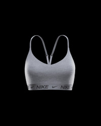 Don't let anything get in the way of expressing yourself in this sleek, low-profile sports bra. Its light support gives you a gentle hold with plenty of freedom that's great for low-impact workouts or all-day comfort. Smooth, quick-drying fabric gives the bra a clean finish so you can wear it your way. More Benefits - Nike Dri-FIT technology moves sweat away from your skin for quicker evaporation, helping you stay dry and comfortable. - Soft jacquard chest band sits snugly against your skin without pinching or binding. Product Details - Body: 78-79% polyester/21-22% spandex. Bottom hem: 53% polyester/28% nylon/19% spandex. Straps: 52% polyester/32% spandex/16% nylon. Lining: 84% polyester/16% spandex. Interlining: 80% polyester/20% spandex. Pad top fabric/Pad back fabric: 100% polyester. Pad: 100% polyurethane. - Machine wash - Imported - Shown: Smoke Grey/Pure - Style: FD1062-085