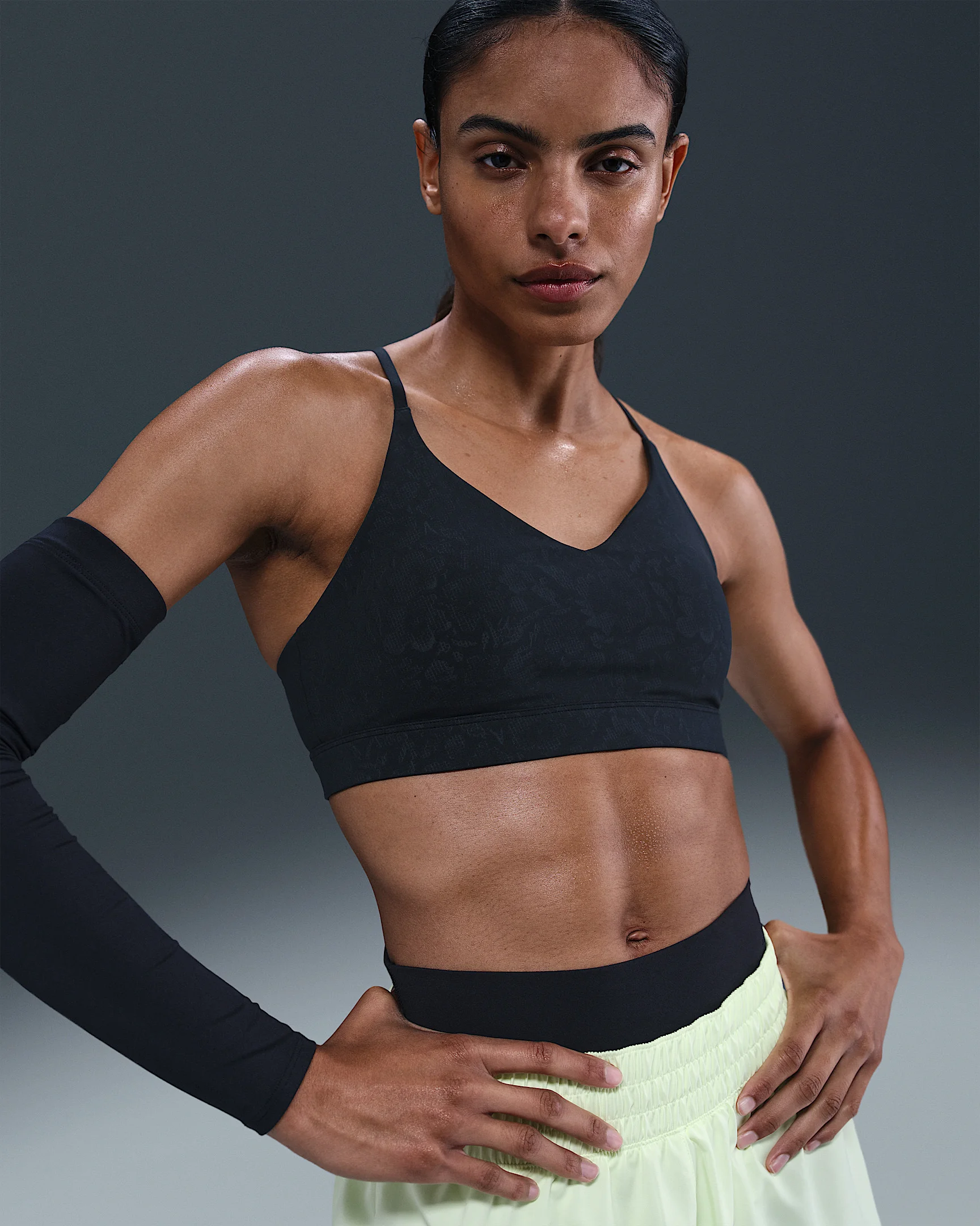 Don't let sweat stop you from expressing yourself. This sleek bra is made with midweight, ultrasmooth fabric that's equipped with moisture-concealing technology. Its light support gives you a gentle hold with plenty of freedom. Product Details - Mesh liner at cups - Allover floral emboss - Reflective Swoosh logo at center back - Not intended for use as Personal Protective Equipment (PPE) - Body: 77% polyester/23% spandex. Lining: 84% polyester/16% spandex. Interlining: 80% polyester/20% spandex. Pad top/back fabric: 100% polyester. Pad: 100% polyurethane. - Machine wash - Imported - Shown: Black/Anthracite/Dark Smoke Grey - Style: HV1205-010 SIZE & FIT Model is wearing size S Model height: 5′10″178cm Model bust: 31″79cm Tight fit: snug and form-fitting Light support: feels ke a soft hug with plenty of freedom