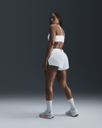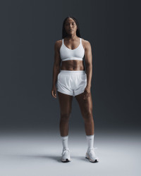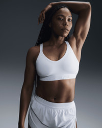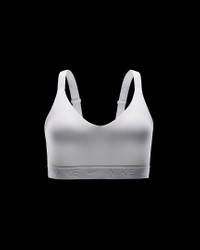 Be unapologetic while you crush your goals in this sleek, secure sports bra. Great for training workouts and dance classes, medium support gives you a snug hold that helps keep everything in place. Smooth, quick-drying fabric gives the bra a clean finish so you can wear it your way. More Benefits - Nike Dri-FIT technology moves sweat away from your skin for quicker evaporation, helping you stay dry and comfortable. - Soft jacquard chest band sits snugly against your skin without pinching or binding. Product Details - Body: 78-79% polyester/21-22% spandex. Bottom hem: 53% polyester/28% nylon/19% spandex. Straps: 73% nylon/27% spandex. Lining: 84% polyester/16% spandex. Interlining: 80% polyester/20% spandex. Pad top fabric/Pad back fabric: 100% polyester. Pad: 100% polyurethane. - Machine wash - Imported - Shown: White/Stone Mauve - Style: FD1065-100 SIZE & FIT Tight fit: snug and form-fitting Medium support: feels ke a snug hold to keep everything in place
