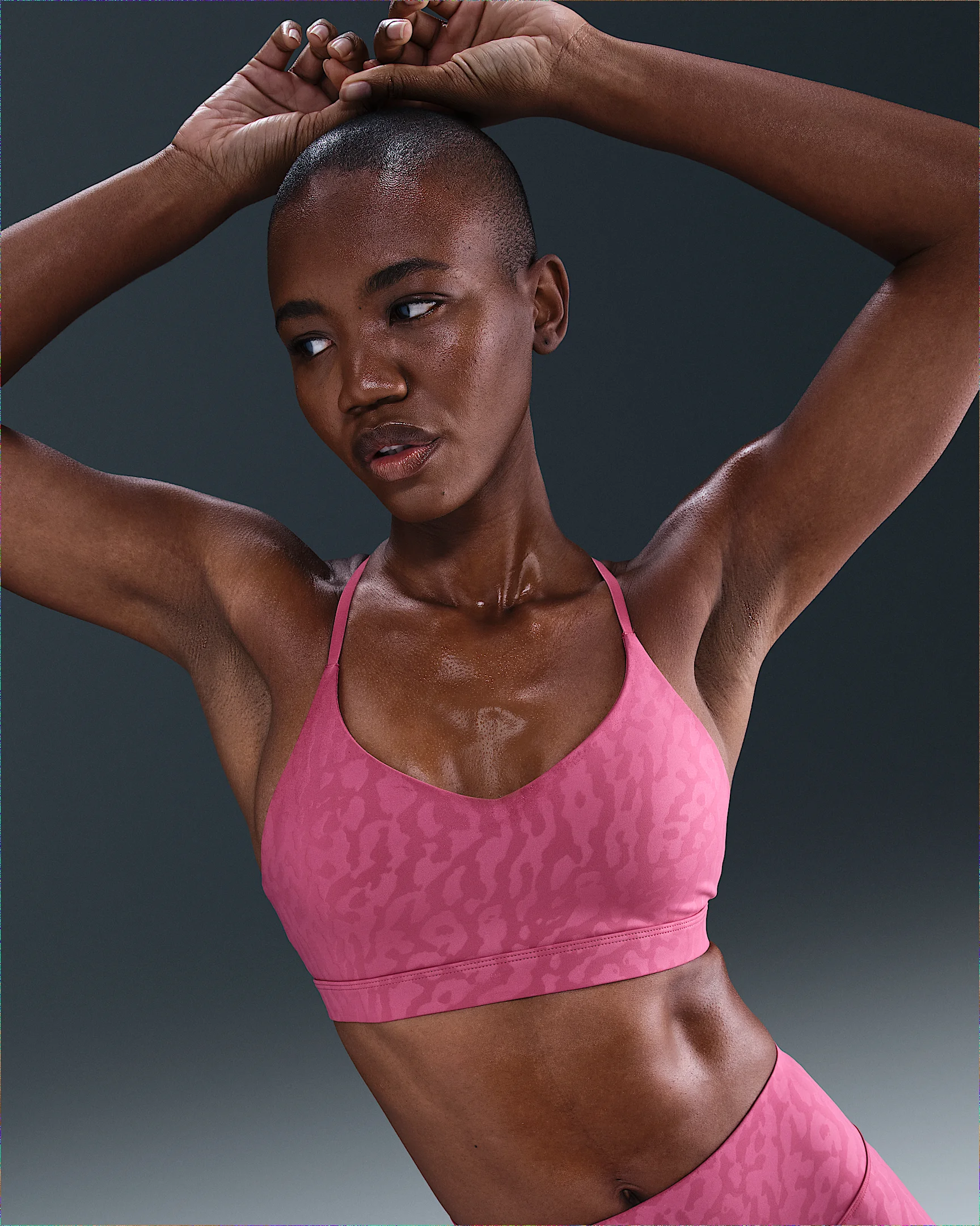 Don't let 'em see you sweat. Our sleek, low-profile Indy bra gets elevated with ultrasmooth, midweight fabric featuring moisture-concealing technology. Light support gives you a gentle hold with plenty of freedom that's great for low-impact workouts or all-day comfort. Product Details - Removable pads - Body: 77% polyester/23% spandex. Lining: 84% polyester/16% spandex. Interlining: 80% polyester/20% spandex. Pad top fabric/Pad back fabric: 100% polyester. Pad: 100% polyurethane. - Imported - Machine wash - Shown: Sweet Beet/Deep Garnet/Rush Maroon - Style: HQ2824-634 SIZE & FIT Model is wearing size S Model height: 5′11″180cm Model bust: 34″86cm Tight fit: snug and form-fitting Light support: feels ke a soft hug with plenty of freedom