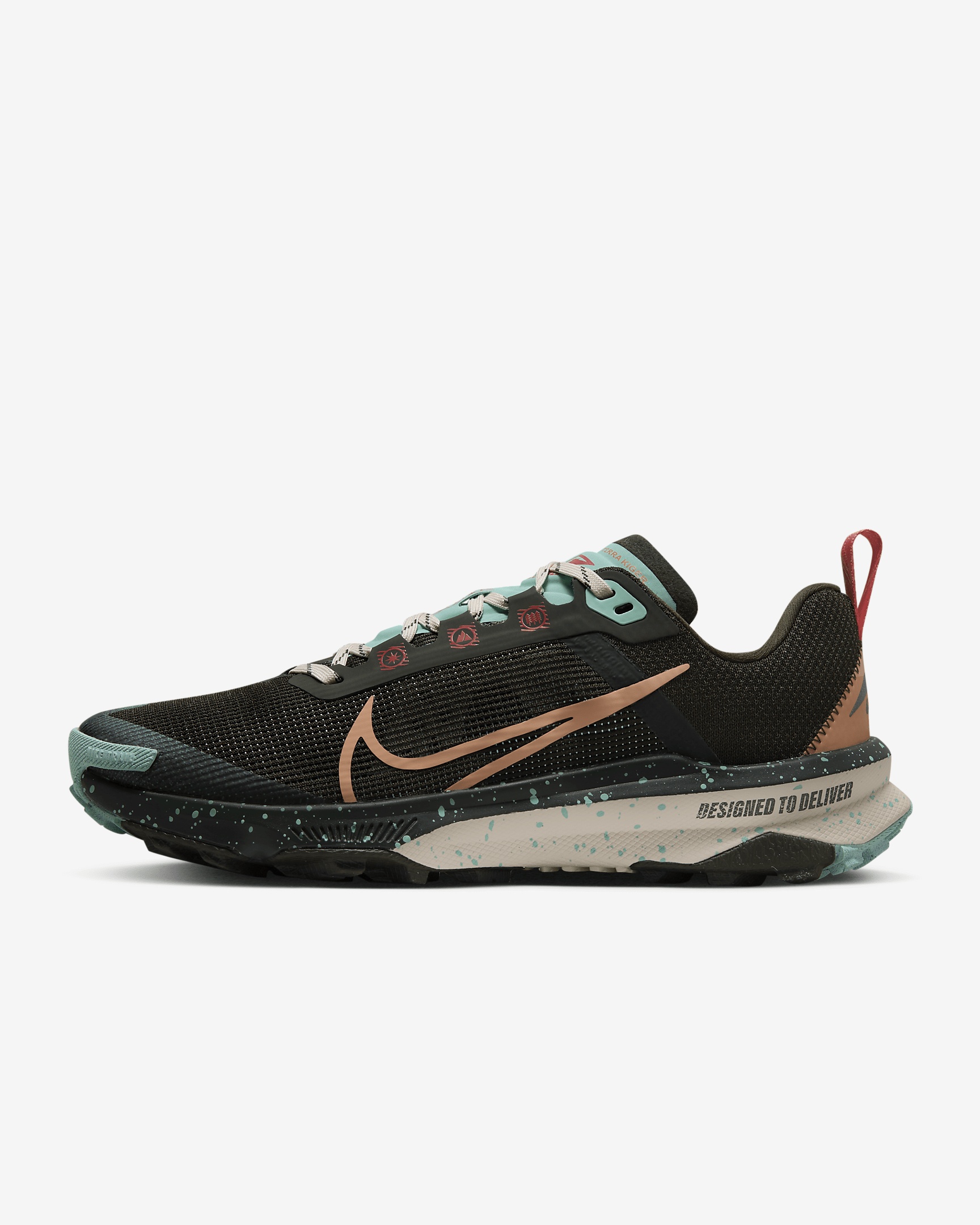 When approaching rocky and technical terrain, go with the comfort and speed of the Kiger 9, there for every unexpected twist and tight turn. Equipped with full-length Nike React foam and a revamped breathable upper, this agile, quick trainer helps keep you zigzagging in and out of trails with speed. It’s lower to the ground and lighter than our previous iteration, so that you can handle the off-road path with pace and security. Product Details - Weight: Approx. 236 g (Women's size 8) - Heel-to-toe drop: 4.5 mm - Not intended for use as Personal Protective Equipment (PPE) - Shown: Sequoia/Emerald Rise/Guava Ice/Amber Brown - Style: DR2694-300