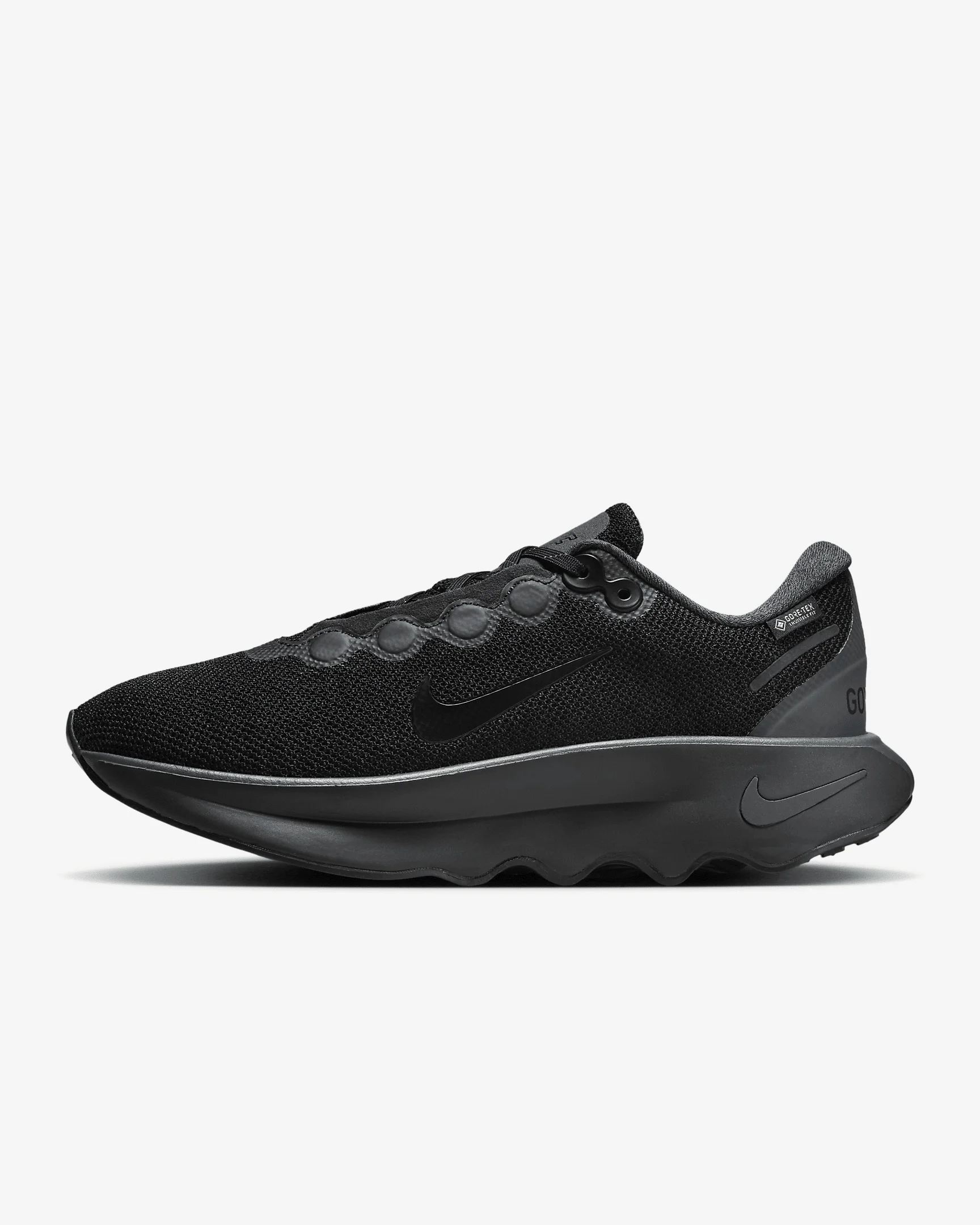 With a waterproof GORE-TEX upper and reflective details, this winterized Nike Motiva is made for wet-weather walks. It provides our highest level of cushioning with a tall foam stack and our Comfortgroove innovation on the outsole to absorb the bumps along the way. And with its exaggerated rocker, it helps propel you forward in ultimate comfort. Benefits - Wet-traction rubber pattern on outsole - Super-high cushioning - Moderate stability - Moderate flexibility Product Details - Reflective laces, overlay and midsole Swoosh logo - Soft foam collar - Widened forefoot, arch and toe box - Durable outsole pattern for traction - Not intended for use as Personal Protective Equipment (PPE) - Shown: Black/Anthracite/Black - Style: HM0355-001 SIZE & FIT Fits small; we recommend ordering a half size up