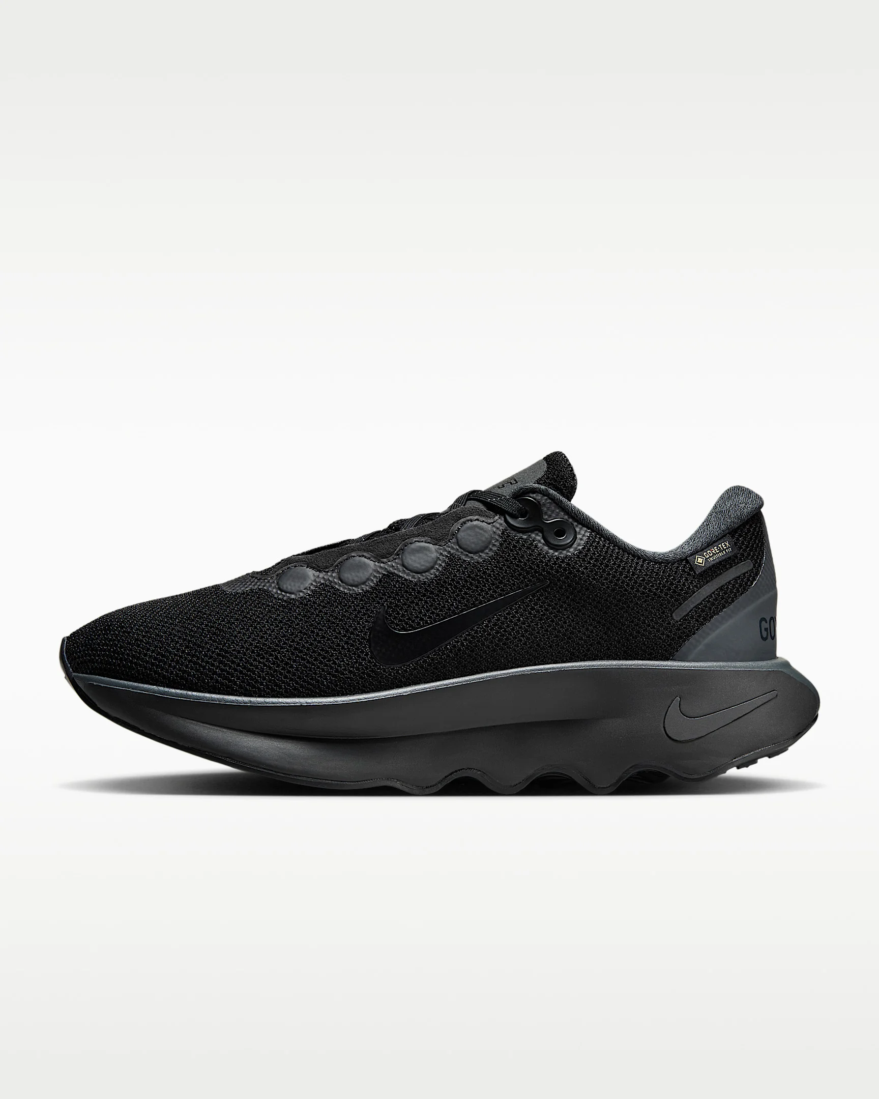With a waterproof GORE-TEX upper and reflective details, this winterized Nike Motiva is made for wet-weather walks. It provides our highest level of cushioning with a tall foam stack and our Comfortgroove innovation on the outsole to absorb the bumps along the way. And with its exaggerated rocker, it helps propel you forward in ultimate comfort. Benefits - Wet-traction rubber pattern on outsole - Super-high cushioning - Moderate stability - Moderate flexibility Product Details - Reflective laces, overlay and midsole Swoosh logo - Soft foam collar - Widened forefoot, arch and toe box - Durable outsole pattern for traction - Not intended for use as Personal Protective Equipment (PPE) - Shown: Black/Anthracite/Black - Style: HM0355-001 SIZE & FIT Fits small; we recommend ordering a half size up