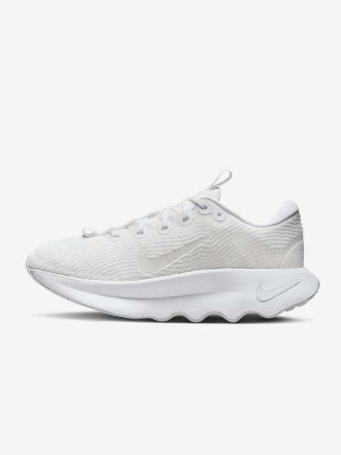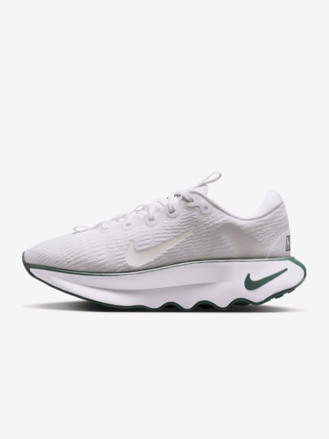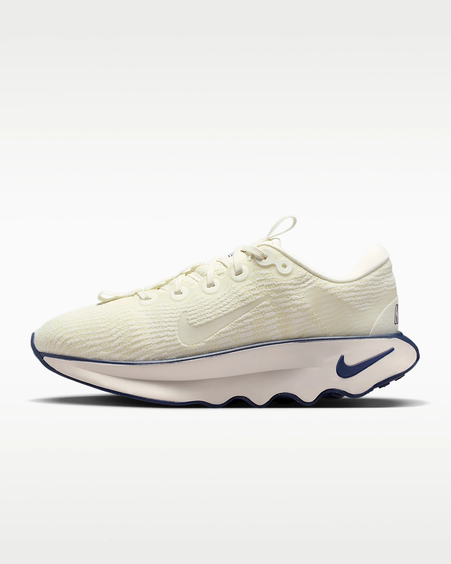 Designed for walking in ultimate comfort, the Nike Motiva provides our highest level of cushioning. A tall foam stack combines with our Comfortgroove innovation on the outsole to absorb the bumps along the way. And its exaggerated rocker helps propel you forward. Benefits - Super-high cushioning - Moderate stability - Moderate flexibility Product Details - Soft foam collar - Widened forefoot, arch and toe box - Durable outsole pattern for traction - Not intended for use as Personal Protective Equipment (PPE) - Shown: Sail/Coconut Milk/Light Orewood Brown/Midnight Navy - Style: DV1238-113 SIZE & FIT Fits small; we recommend ordering a half size up