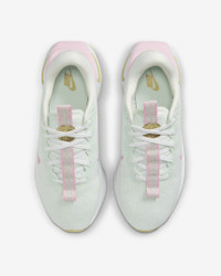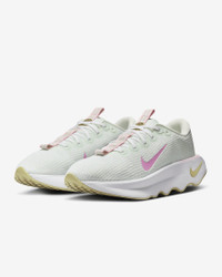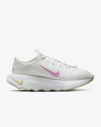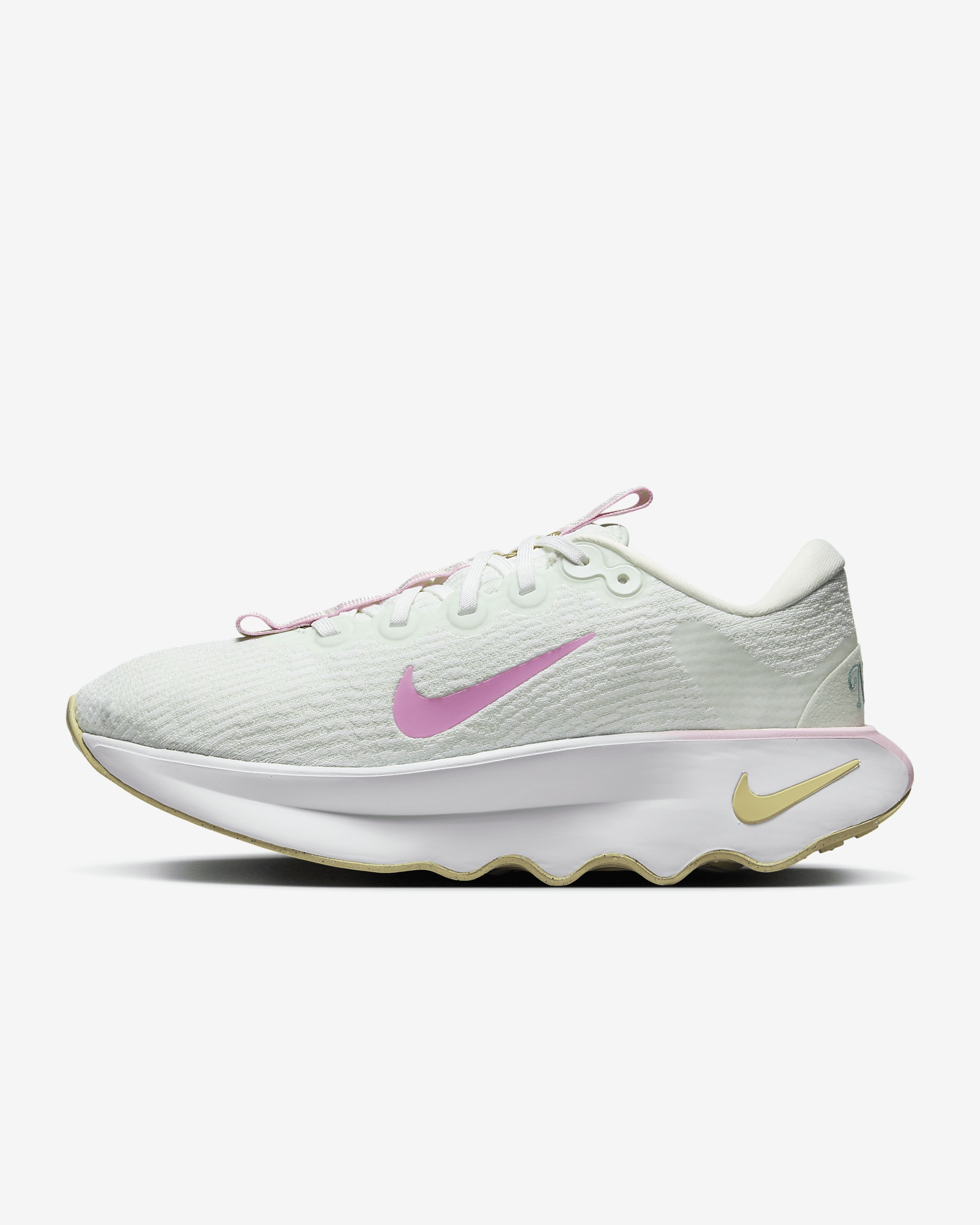 Designed for walking in ultimate comfort, the Nike Motiva provides our highest level of cushioning. A tall foam stack combines with our Comfortgroove innovation on the outsole to absorb the bumps along the way. And its exaggerated rocker helps propel you forward. Benefits - Super-high cushioning - Moderate stability - Moderate flexibility Product Details - Soft foam collar - Widened forefoot, arch and toe box - Durable outsole pattern for traction - Shown: White/White/Team Gold/Green Frost - Style: HM3731-131