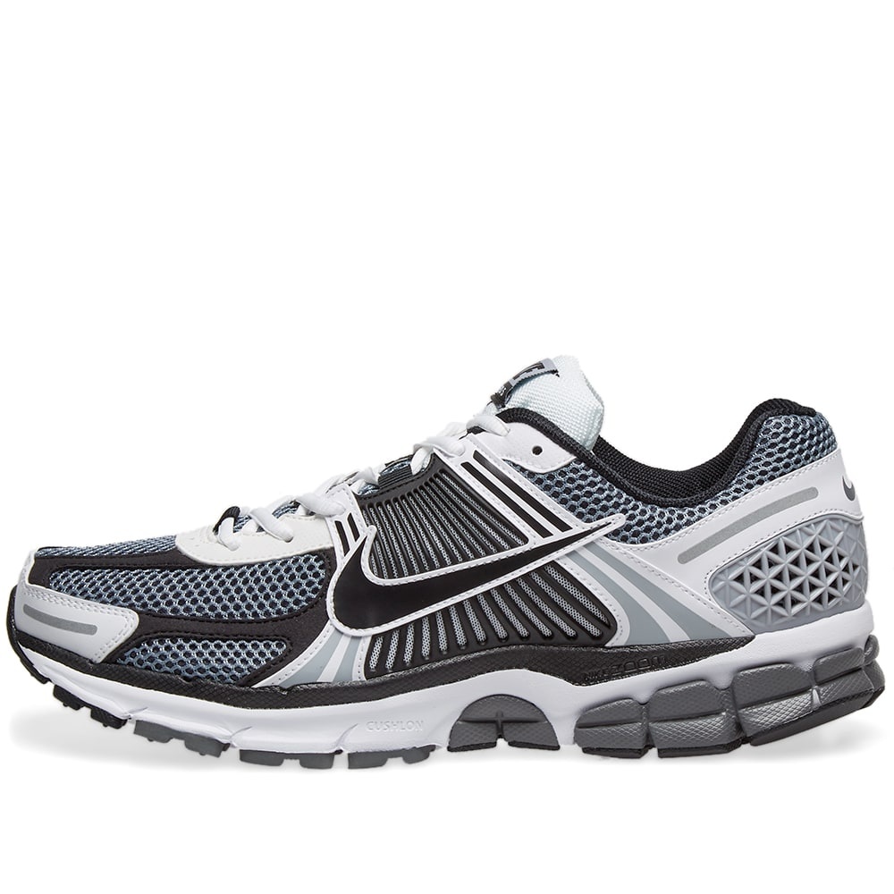 Revitalised, fresh and better than ever, the Nike Zoom Vomero 5 returns in sleek black, white, and grey. Featuring layered technical mesh, smooth leather, and TecTuff® overlays, this performance sneaker ensures support, breathability, and style. Reflective accents and bold Swoosh branding elevate its look, while dual Air units enhance comfort. - Mesh Upper - Leather & TecTuff® Overlays - 3M Detailing - Zoom Air Cushioning - Foam Midsole - Rubber Outsole