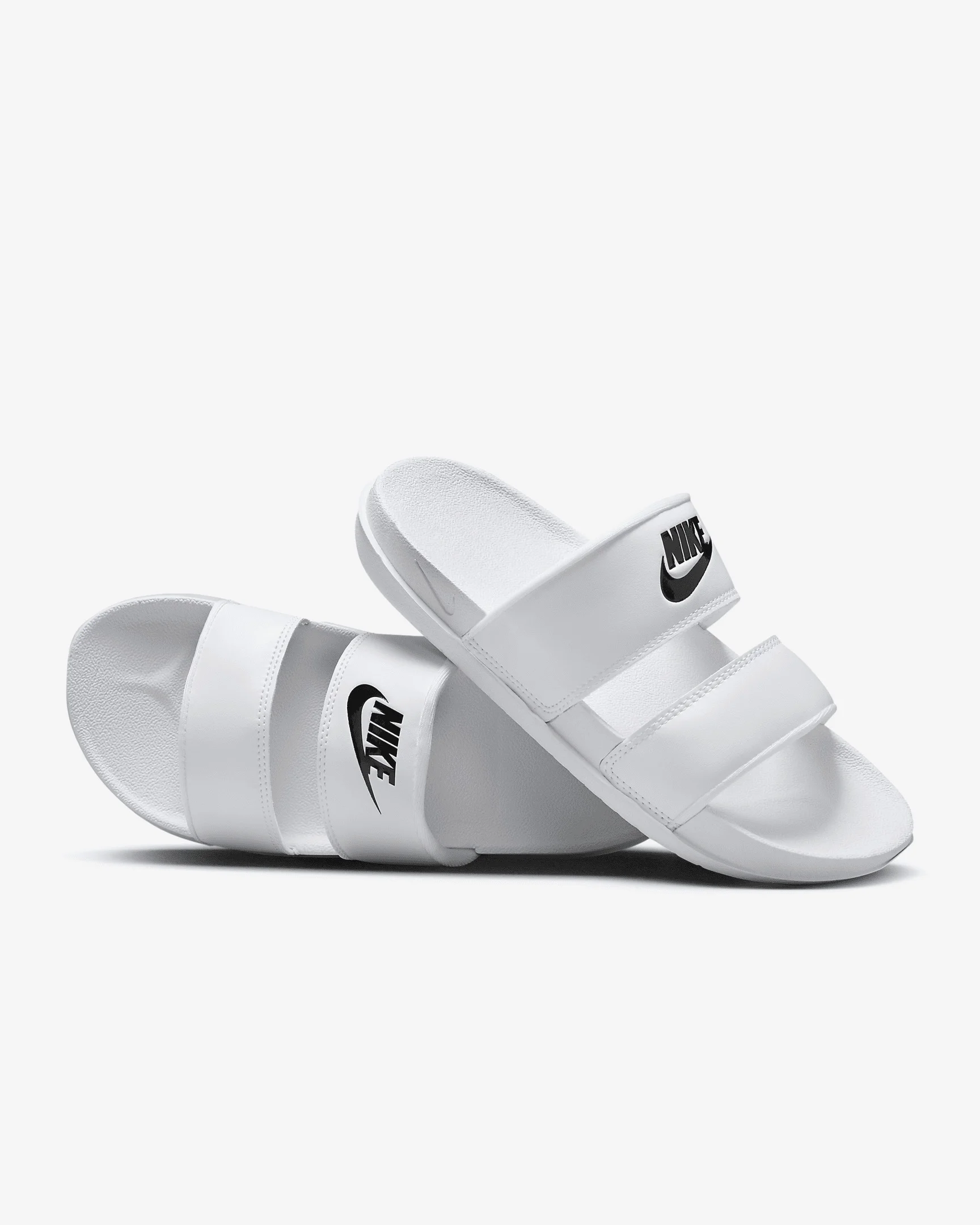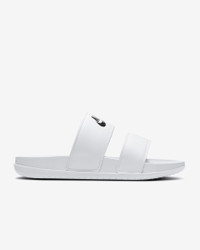 Bringing a fresh look to the classic slide, the Nike Offcourt Duo features twin straps for a chic look you can wear with jeans or leggings and everything in between. Its foam footbed feels unbelievably soft while its plush straps are lined with cloud-like fabric that rolls over the top to help eliminate hotspots. The micro-textured footbed helps keep your foot in place while the sole adds traction that lasts. Benefits - The foam footbed cradles your foot while adding cloud-like comfort. - The duo strap design features plush padding and ultra-soft lining that rolls over the top to eliminate hotspots. - The wider top strap helps secure your foot. - The EVA sole is designed to grip the ground, adding traction and durability. - The micro-textured footbed helps keep your foot in place. Product Details - "NIKE" and Swoosh design on top strap - Shown: White/White/Black - Style: DC0496-100 SIZE & FIT Fits small; we recommend ordering a half size up
