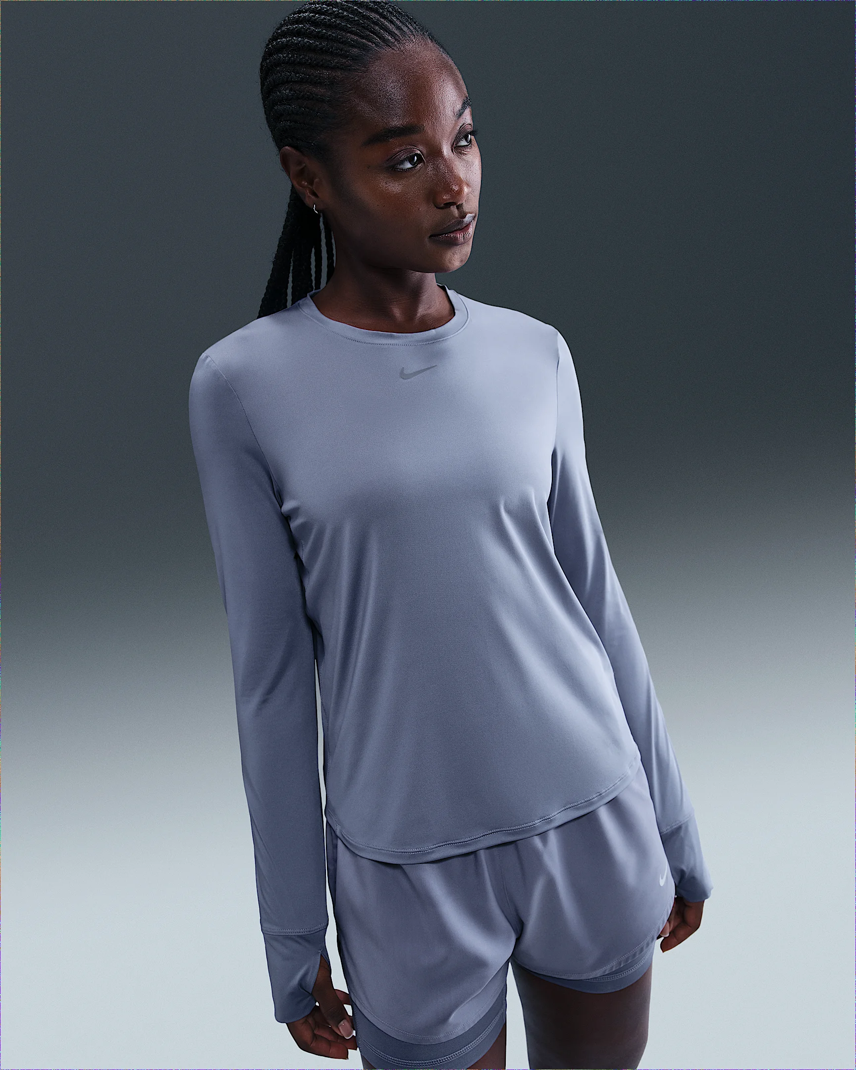 Up for a workout or down to chill, this Nike One Classic top is ready for whatever you are. Lightweight, silky-smooth fabric dries quickly and works for wherever your day takes you. A timeless, easy-fitting style and sweat-wicking tech help you feel confident, comfortable and dry from your morning stroll to your evening wind-down—and at all the stops in between. More Benefits - Nike Dri-FIT technology moves sweat away from your skin for quicker evaporation, helping you stay dry and comfortable. - Thumbholes let you extend your coverage and help hold the sleeves in place while you move. Product Details - 89% polyester/11% spandex - Machine wash - Imported - Reflective logo at center chest - Not intended for use as Personal Protective Equipment (PPE) - Shown: World Indigo - Style: FN2801-499 SIZE & FIT Standard fit: easy and traditional
