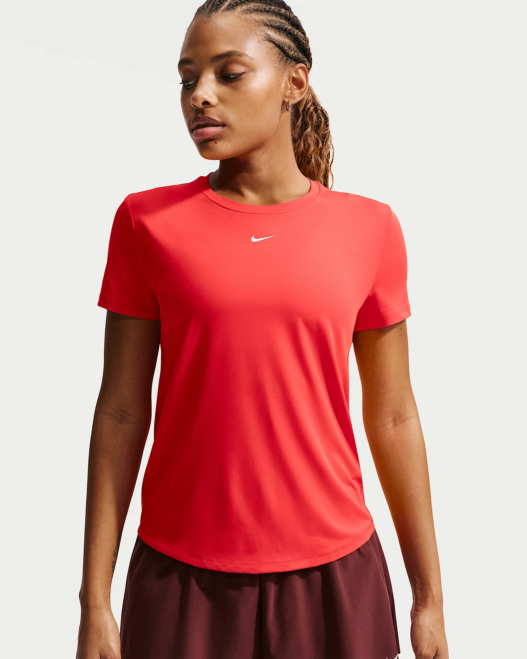 Up for a workout or down to chill, this Nike One Classic top is ready for whatever you are. Lightweight, silky-smooth fabric dries quickly and works for wherever your day takes you. A timeless, easy-fitting style and sweat-wicking tech help you feel confident, comfortable and dry from your morning stroll to your evening wind-down—and at all the stops in between. Product Details - 89% polyester/11% spandex - Machine wash - Imported - Reflective logo at center chest - Not intended for use as Personal Protective Equipment (PPE) - This product provides UVA and UVB protection from the sun only in the areas covered by the garment. To protect exposed areas, the use of good quality sunscreen is recommended. - Shown: Light Crimson/White - Style: FN2798-696 SIZE & FIT Model is wearing size S and is 5′11″179cm Standard fit: easy and traditional