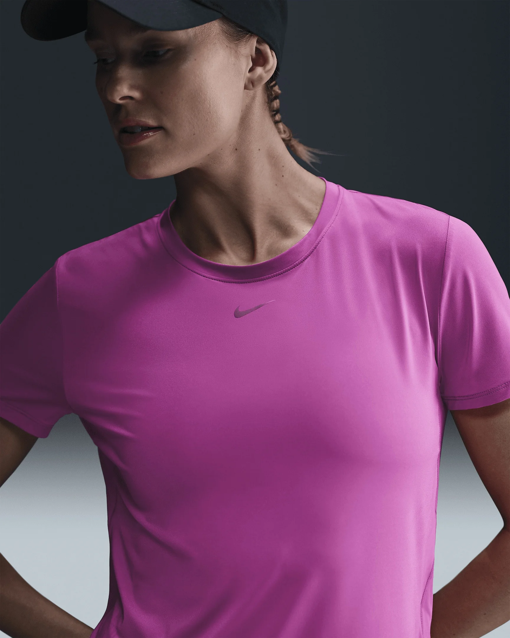 Up for a workout or down to chill, this Nike One Classic top is ready for whatever you are. Lightweight, silky-smooth fabric dries quickly and works for wherever your day takes you. A timeless, easy-fitting style and sweat-wicking tech help you feel confident, comfortable and dry from your morning stroll to your evening wind-down—and at all the stops in between. Product Details - 89% polyester/11% spandex - Machine wash - Imported - Reflective logo at center chest - Not intended for use as Personal Protective Equipment (PPE) - Shown: Hot Fuchsia/Black - Style: FN2798-518 SIZE & FIT Model is wearing size S and is 5′11″180cm Standard fit: easy and traditional