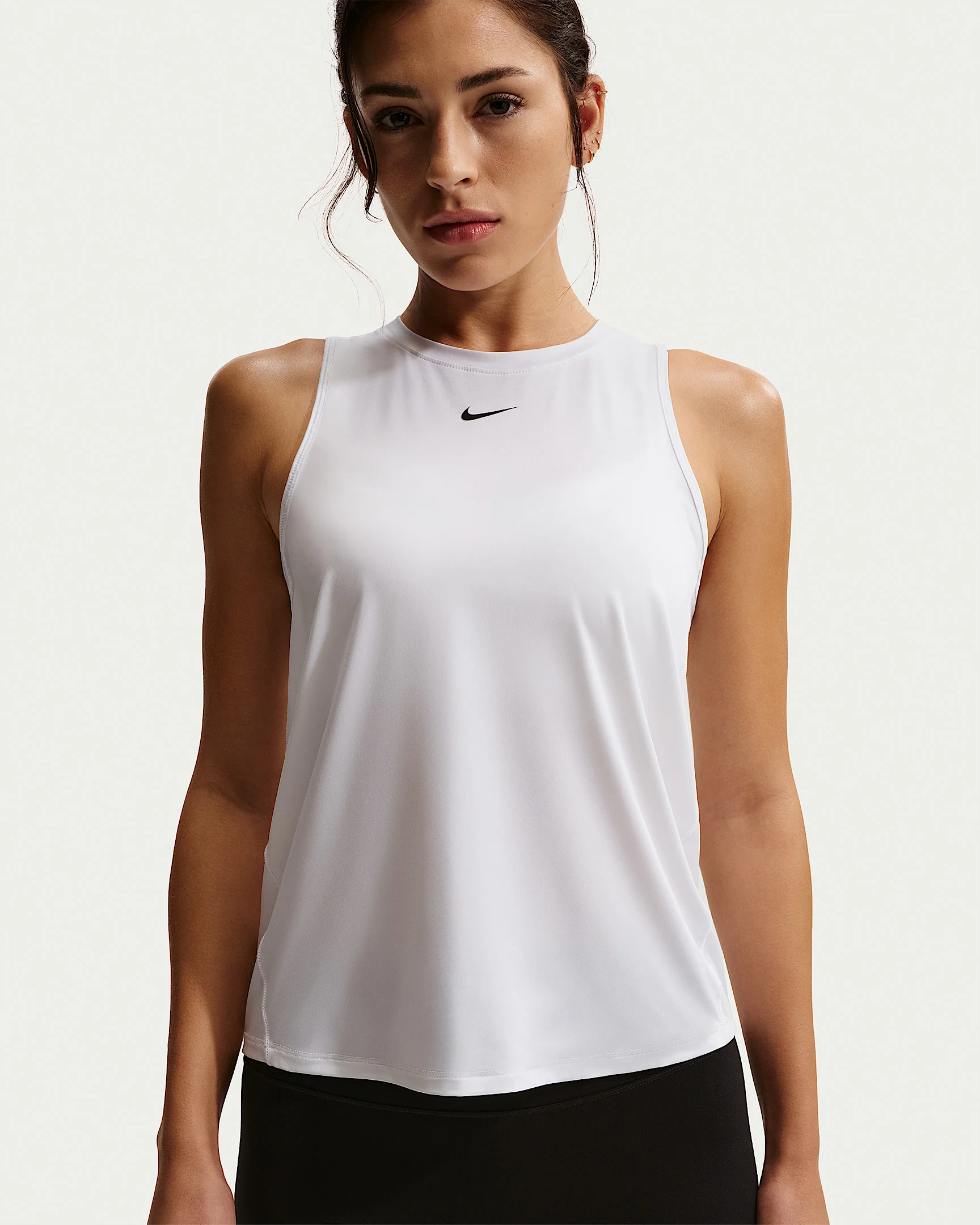 Up for a workout or down to chill, this Nike One Classic tank top is ready for whatever you are. Lightweight, silky-smooth fabric dries quickly and works for wherever your day takes you. A timeless, easy-fitting style and sweat-wicking tech help you feel confident, comfortable and dry from your morning stroll to your evening wind-down—and at all the stops in between. Product Details - 89% polyester/11% spandex - Machine wash - Imported - Reflective logo at center chest - Not intended for use as Personal Protective Equipment (PPE) - This product provides UVA and UVB protection from the sun only in the areas covered by the garment. To protect exposed areas, the use of good quality sunscreen is recommended. - Shown: White/Black - Style: FN2808-101 SIZE & FIT Model is wearing size S and is 5'9"174cm Standard fit: easy and traditional