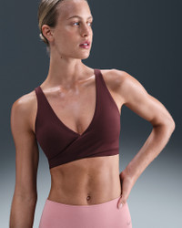 Move easy in this wrap style bra. Its light support provides a gentle hold with plenty of freedom. A sleek breathable liner combines with midweight, peachy-soft fabric that dries quickly and stretches with you. Benefits - Nike Dri-FIT technology moves sweat away from your skin for quicker evaporation, helping you stay dry and comfortable. - Removable pads let you choose your coverage. Product Details - Body/Interlining: 80% polyester/20% spandex. Lining: 88% polyester/12% spandex. Pad top fabric/Pad back fabric: 100% polyester. Pad: 100% polyurethane. - Machine wash - Imported - Shown: Burgundy Crush/Burgundy Ash - Style: HQ2813-652 SIZE & FIT Model is wearing size S Model height: 5′11″180cm Model bust: 32″81cm Tight fit: snug and form-fitting Light support: feels ke a soft hug with plenty of freedom