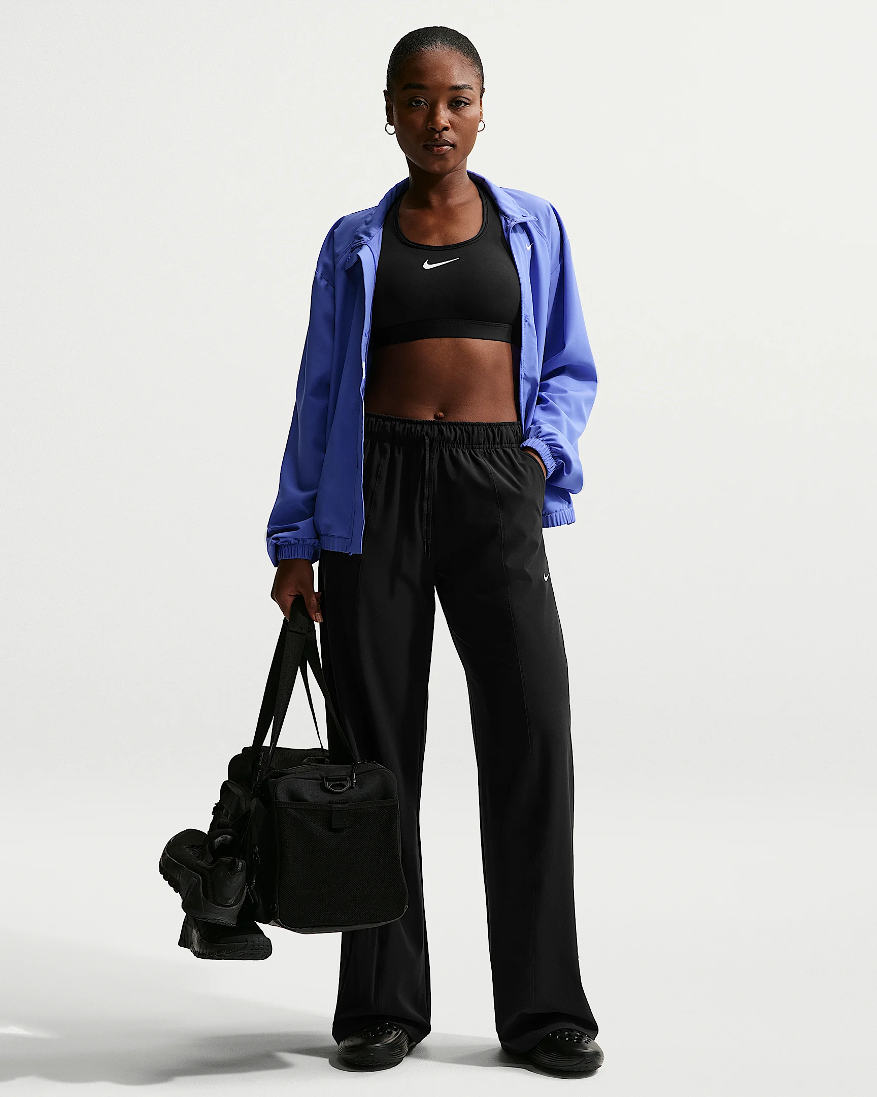 These Nike One pants work for it all. Unbelievably soft and lightweight, they have plenty of stretch plus wide-legs and a roomy fit for you to move comfortably. Benefits - Nike Dri-FIT technology moves sweat away from your skin for quicker evaporation, helping you stay dry and comfortable. - Lightweight woven material wicks and stretches through your moves. Product Details - Elastic waistband with drawcord - Swoosh logo - Body: 87% polyester/13% spandex; Pocket bags: 100% polyester - Machine Wash - Imported - Shown: Black/White - Style: IQ0342-010 SIZE & FIT Model is wearing size S and is 5′8″173cm Loose fit: roomy and relaxed Fl length: hits below ankle