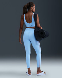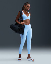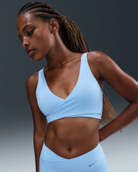 Move easy in this wrap style bra. Its light support provides a gentle hold with plenty of freedom. A sleek breathable liner combines with midweight, peachy-soft fabric that dries quickly and stretches with you. Benefits - Nike Dri-FIT technology moves sweat away from your skin for quicker evaporation, helping you stay dry and comfortable. - Removable pads let you choose your coverage. Product Details - Body/Interlining: 80% polyester/20% spandex. Lining: 88% polyester/12% spandex. Pad top fabric/Pad back fabric: 100% polyester. Pad: 100% polyurethane. - Machine wash - Imported - Shown: Celestine Blue/Work Blue - Style: HQ2813-441 SIZE & FIT Tight fit: snug and form-fitting Light support: feels ke a soft hug with plenty of freedom