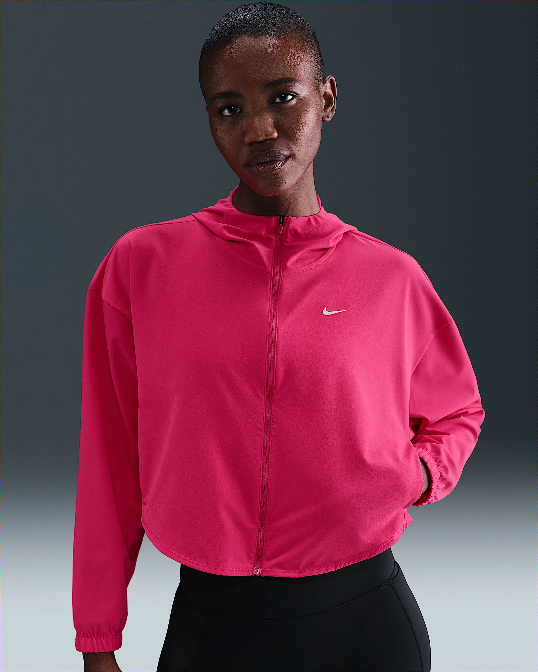 Nike One works for it all. Lightweight and flowy, this spacious jacket has a water-repellent finish and plenty of stretch for coverage and comfort through every activity. Benefits - Water-repellent finish helps keep you dry in wet weather. - Mesh pocket bags help keep moisture off your essentials. Product Details - Front hand pockets - Full-zip design - Elastic at cuffs - Swoosh logo at left chest - Body: 85% polyester/15% spandex. Mesh: 100% polyester. - Machine wash - Imported - Shown: Rush Pink/White - Style: IH8600-666 SIZE & FIT Oversized fit: exaggerated and spacious