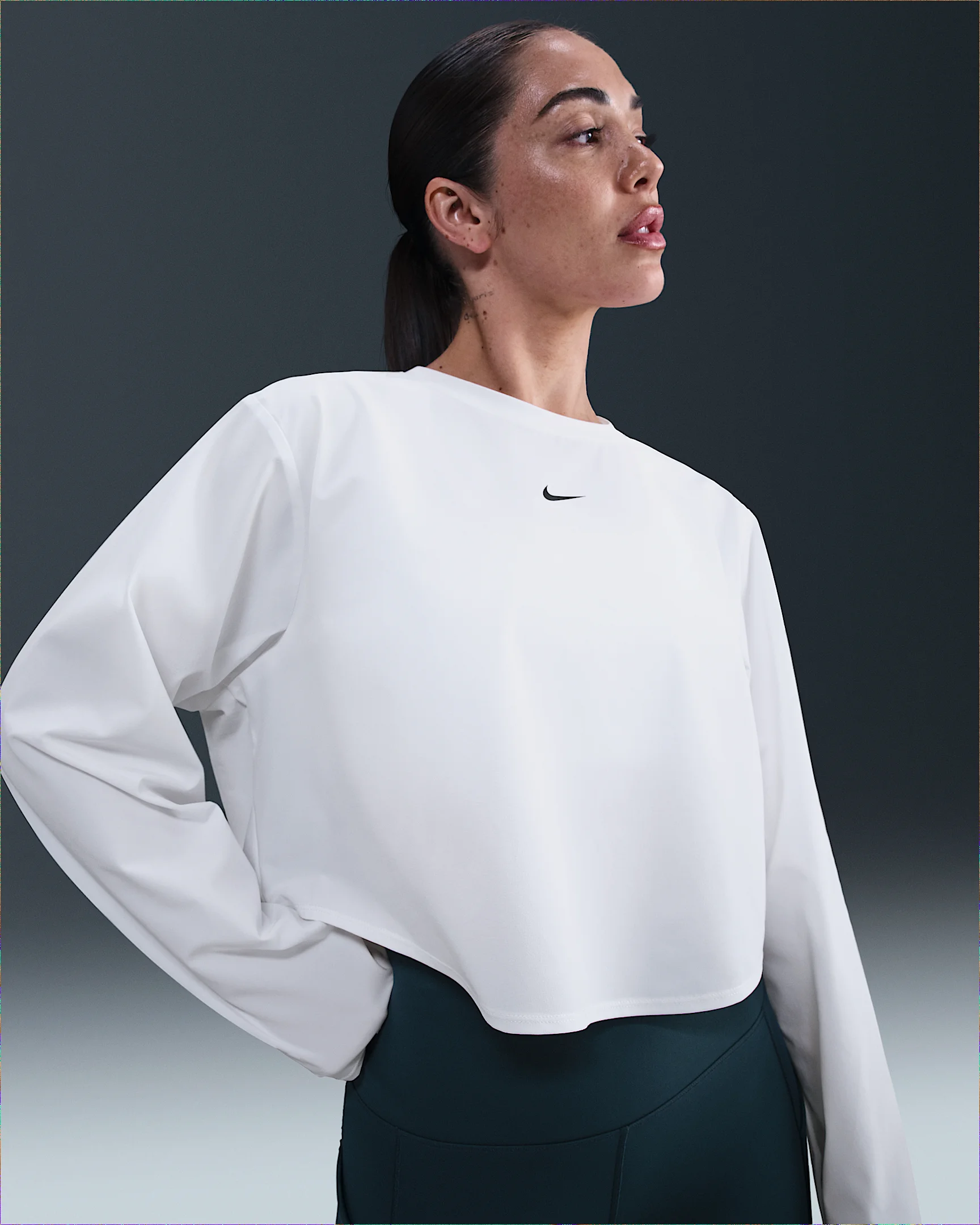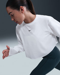Nike One works for it all. Lightweight and water-repellent, this roomy top wicks sweat and stretches with you through every move. Benefits - Water-repellent finish helps keep you dry in wet weather. - Overlay panel at upper back adds dimension. Product Details - Swoosh logo - 85% polyester/15% spandex - Machine wash - Imported - Shown: White/Black - Style: IM7044-100 SIZE & FIT Model is wearing size S and is 5′6″168cm Loose fit: roomy and relaxed