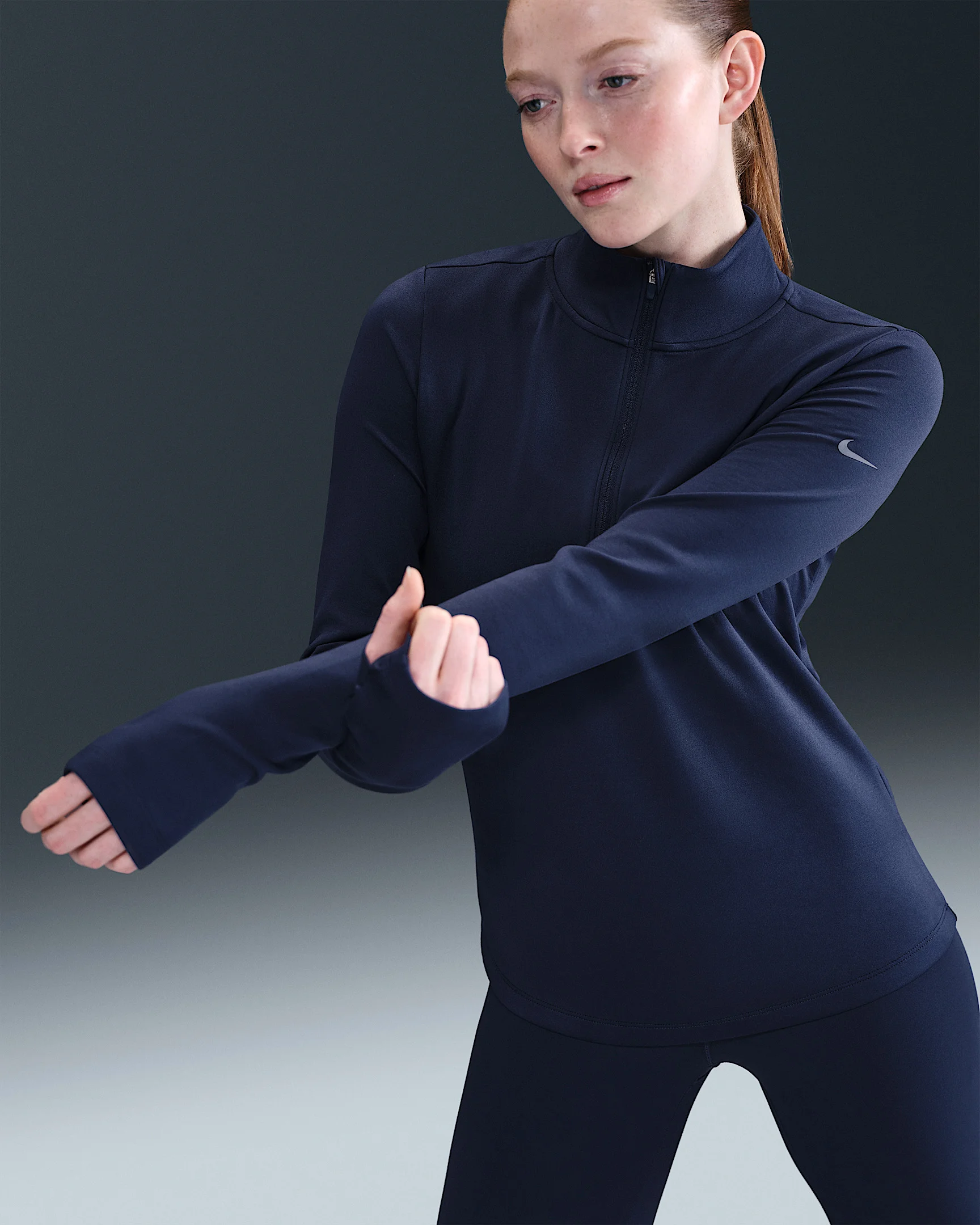 Bring on the cold. This heat-regulating mid layer is unbelievably soft and cozy while high stretch fabric keeps you ready to move. It's updated with thumbholes to give you extra coverage. Benefits - Nike Therma-FIT technology helps manage your body’s natural heat to help keep you warm in cold-weather conditions. - Thumbholes let you extend your coverage and help hold the sleeves in place while you move. - Unbelievably soft on inside and smooth on the outside. Product Details - Zipper guard at neck - 80% polyester/20% spandex - Machine wash - Imported - Not intended for use as Personal Protective Equipment (PPE) - Shown: Midnight Navy/White - Style: HV3688-410 SIZE & FIT Model is wearing size S and is 5′7″170cm Standard fit: easy and traditional