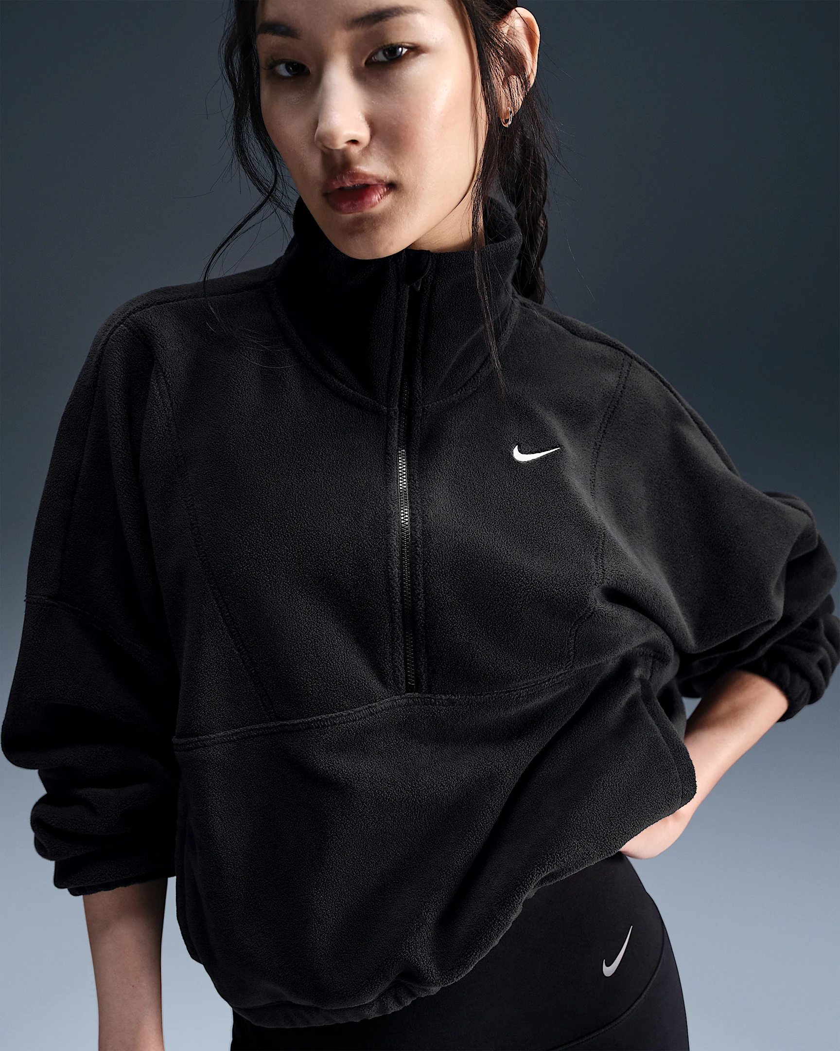 Cozy up in this spacious 1/2-zip top. Its lightweight fleece is brushed on both sides and enhanced with heat-regulating tech for all-around fuzzy comfort. Benefits - Nike Therma-FIT technology helps manage your body’s natural heat to help keep you warm in cold-weather conditions. - Oversized fit makes for easy layering. Product Details - Embroidered Swoosh logo - Encased elastic cuffs and hem - Kangaroo pocket - Body: 100% polyester. Pocket bags: 75% polyester/13% cotton/12% rayon. - Machine wash - Imported - Shown: Black/White - Style: FV7955-010 SIZE & FIT Model is wearing size S and is 5′9″175cm Oversized fit: exaggerated and spacious
