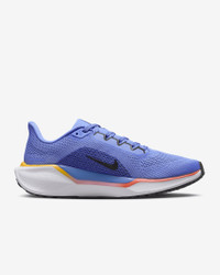 Responsive cushioning in the Pegasus provides an energized ride for everyday road running. Experience lighter-weight energy return with dual Air Zoom units and a ReactX foam midsole. Plus, improved engineered mesh on the upper decreases weight and increases breathability. Benefits - Upgraded breathable engineered mesh upper - ReactX foam midsole surrounds forefoot and heel Air Zoom units for an energized ride. - Signature waffle-inspired rubber outsole for traction and flexibility - Plush collar tongue and sockliner for a secure and comfortable fit - What's new? All-new ReactX foam midsole is 13% more responsive than previous React technology. - Crafted for performance and planet, ReactX foam is engineered to reduce its carbon footprint by at least 43% in a pair of midsoles due to reduced manufacturing process energy compared to prior React foam. The carbon footprint of ReactX is based on cradle-to-gate assessment reviewed by PRe Sustainability B.V and Intertek China. Other midsole components such as airbags, plates or other foam formulations were not considered. Product Details - Weight: Approx. 251 g/8.8 oz (Women's US 8) - Heel-to-toe drop: 10 mm - MR-10 Last - Our best, most consistent fit (same as Pegasus 40) - Not intended for use as Personal Protective Equipment (PPE) - Shown: Royal Pulse/Astronomy Blue/Laser Orange/Black - Style: FD2723-402