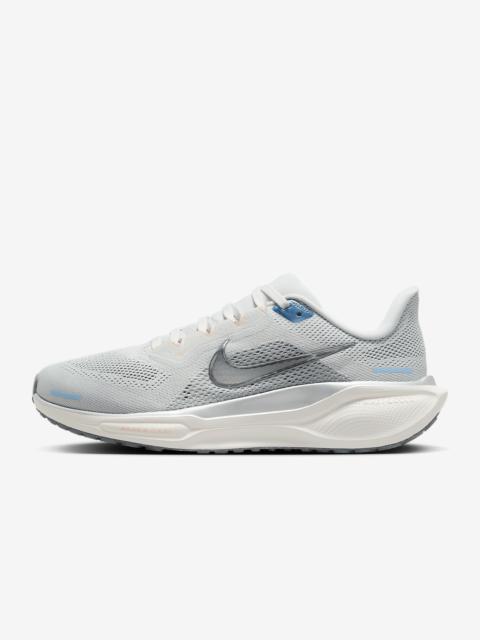 Responsive cushioning in the Pegasus provides an energized ride for everyday road running. Experience lighter-weight energy return with dual Air Zoom units and a ReactX foam midsole. Plus, improved engineered mesh on the upper decreases weight and increases breathability. Benefits - Upgraded breathable engineered mesh upper - ReactX foam midsole surrounds forefoot and heel Air Zoom units for an energized ride. - Signature waffle-inspired rubber outsole for traction and flexibility - Plush collar tongue and sockliner for a secure and comfortable fit - What's new? All-new ReactX foam midsole is 13% more responsive than previous React technology. - Crafted for performance and planet, ReactX foam is engineered to reduce its carbon footprint by at least 43% in a pair of midsoles due to reduced manufacturing process energy compared to prior React foam. The carbon footprint of ReactX is based on cradle-to-gate assessment reviewed by PRe Sustainability B.V and Intertek China. Other midsole components such as airbags, plates or other foam formulations were not considered. Product Details - Weight: Approx. 251 g/8.8 oz (Women's US 8) - Heel-to-toe drop: 10 mm - MR-10 Last - Our best, most consistent fit (same as Pegasus 40) - Not intended for use as Personal Protective Equipment (PPE) - Shown: Black/Anthracite/Black - Style: FD2723-001