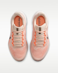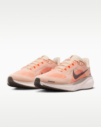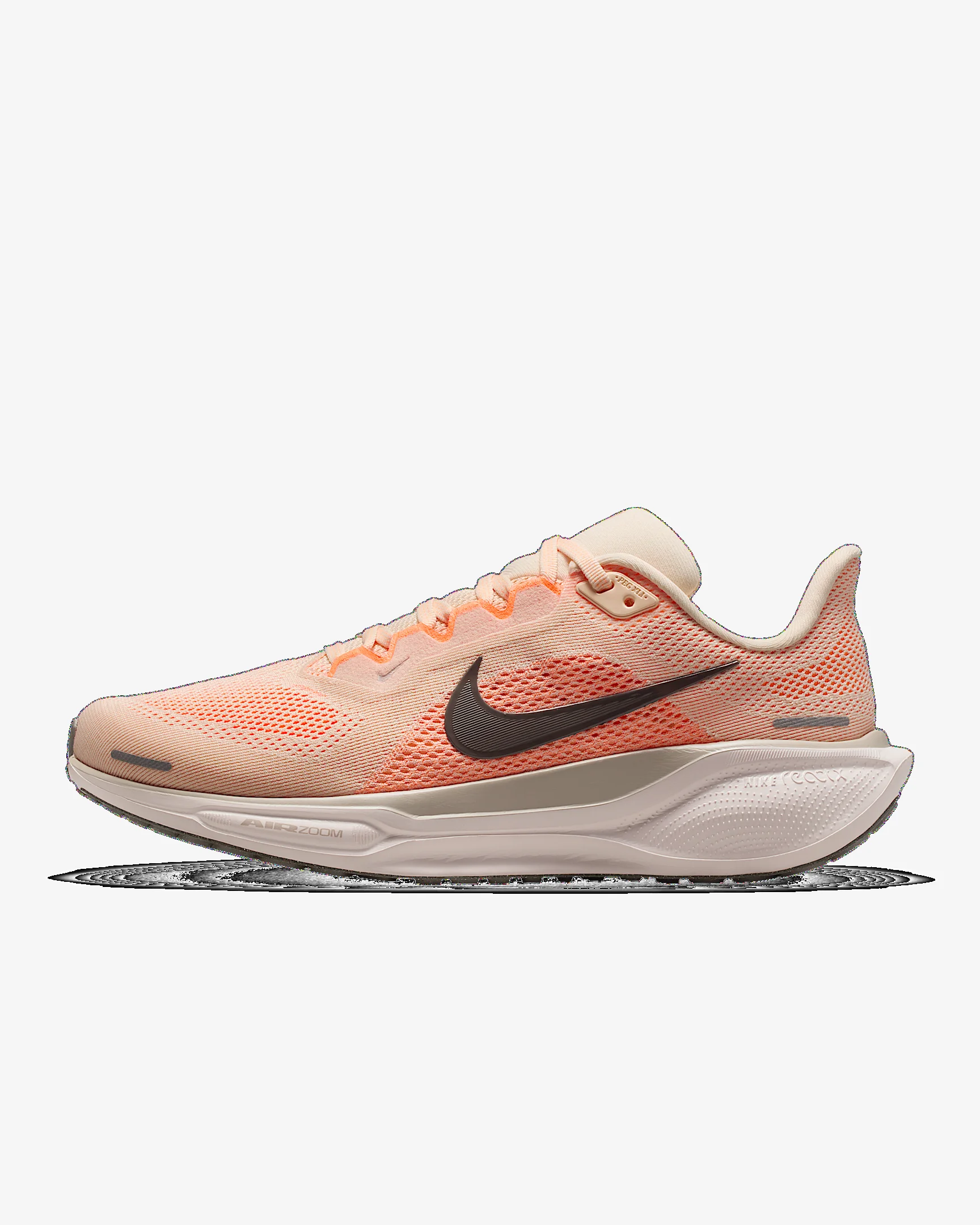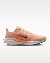 Responsive cushioning in the Pegasus provides an energized ride for everyday road running. Experience lighter-weight energy return with dual Air Zoom units and a ReactX foam midsole. Plus, improved engineered mesh on the upper decreases weight and increases breathability. More Benefits - ReactX foam midsole is 13% more responsive than previous React technology. - Engineered mesh upper is lighter and more breathable than the Pegasus 40. Product Details - Weight: Approx. 251g/8.9oz (Women's US 8) - Heel-to-toe drop: 10mm - MR-10 Last - Our best, most consistent fit (same as Pegasus 40) - Reflective details - Not intended for use as Personal Protective Equipment (PPE) - Shown: Guava Ice/Orange Pulse/Malt/Cave Stone - Style: FQ0965-802 SIZE & FIT Fits large; we recommend ordering a half size down